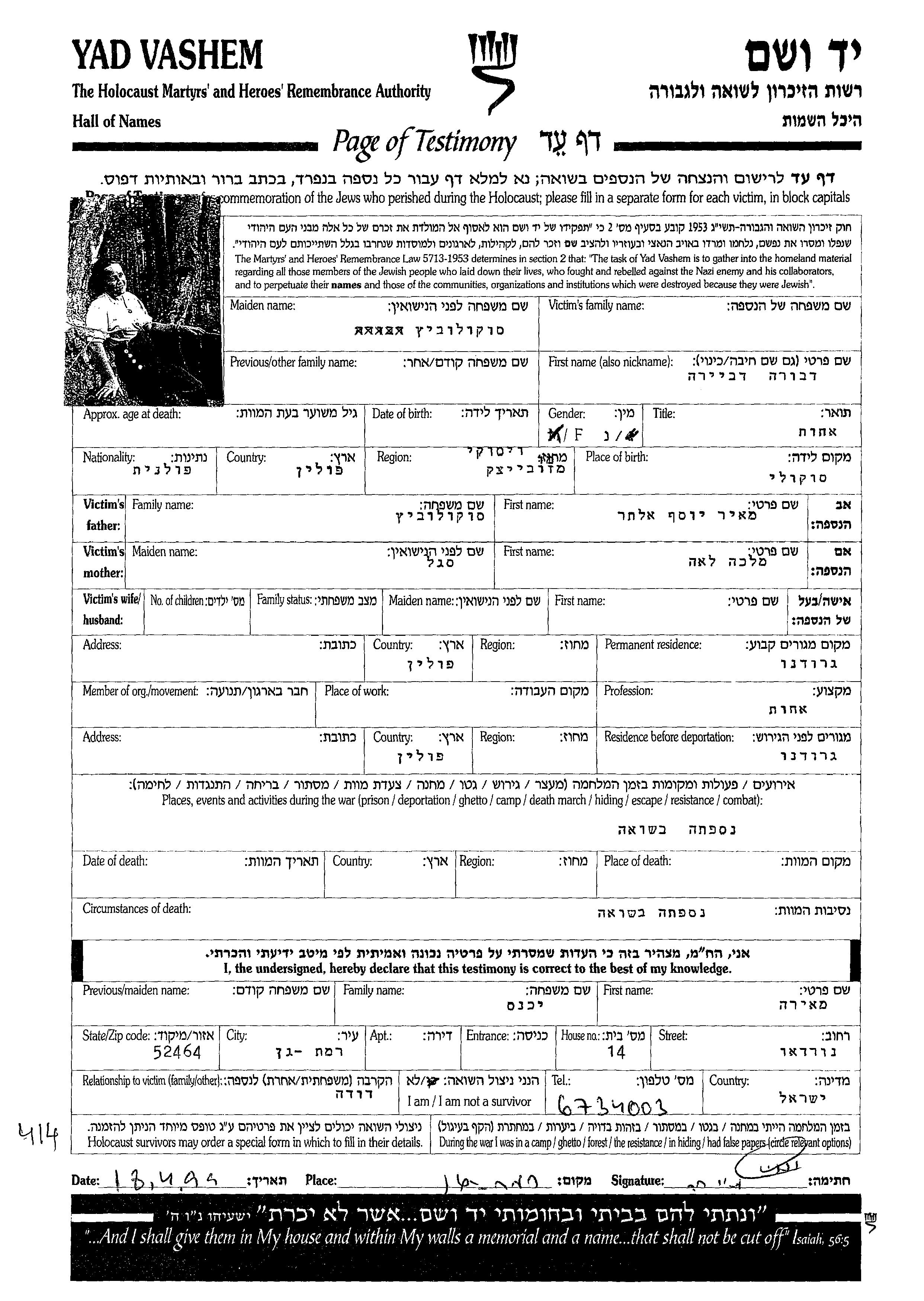 Dvora wurde in der Schoah ermordet. Todesort: unbekannter Ort.