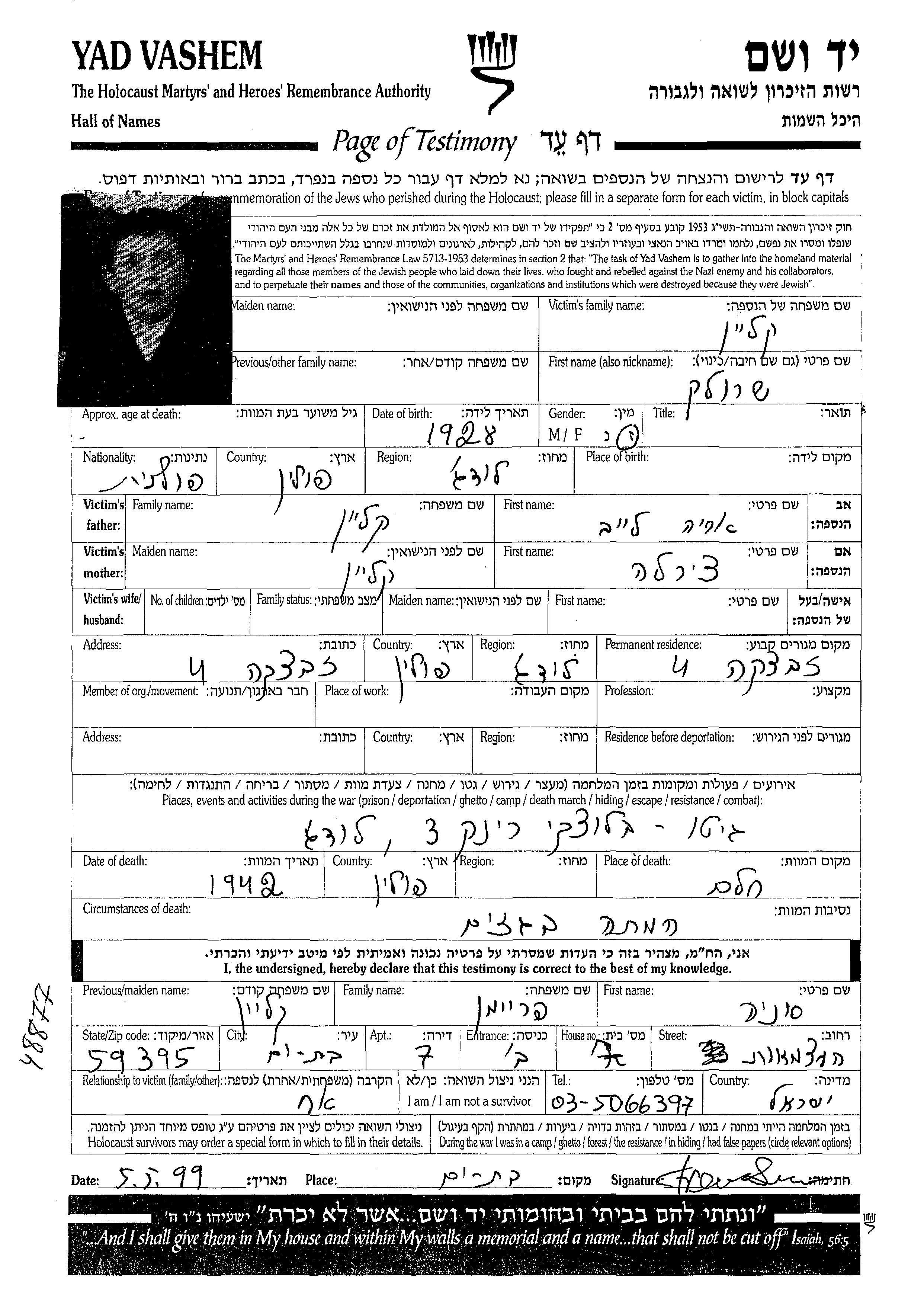 Yisrael wurde in der Schoah ermordet. Todesort: Chelm, Polen im Jahr 1942.