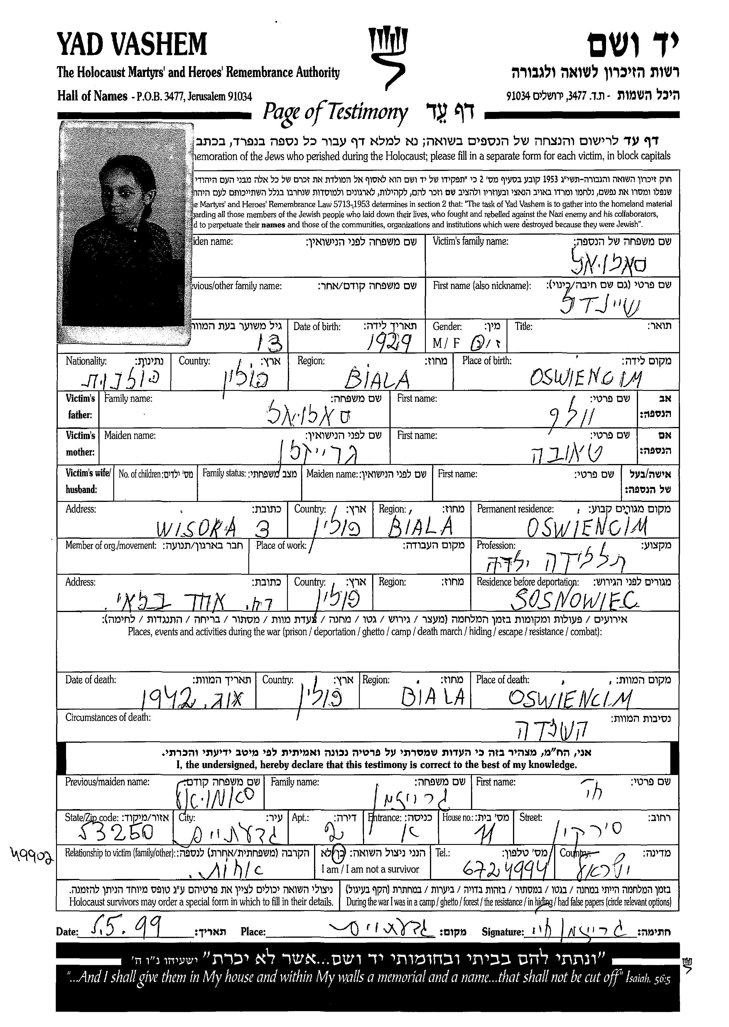 Sheindl Samuel wurde im Jahr 1929 in Oświęcim, Polen geboren. Sie war Schüler/-in. Vor dem Zweiten Weltkrieg lebte sie in Oświęcim, Polen.