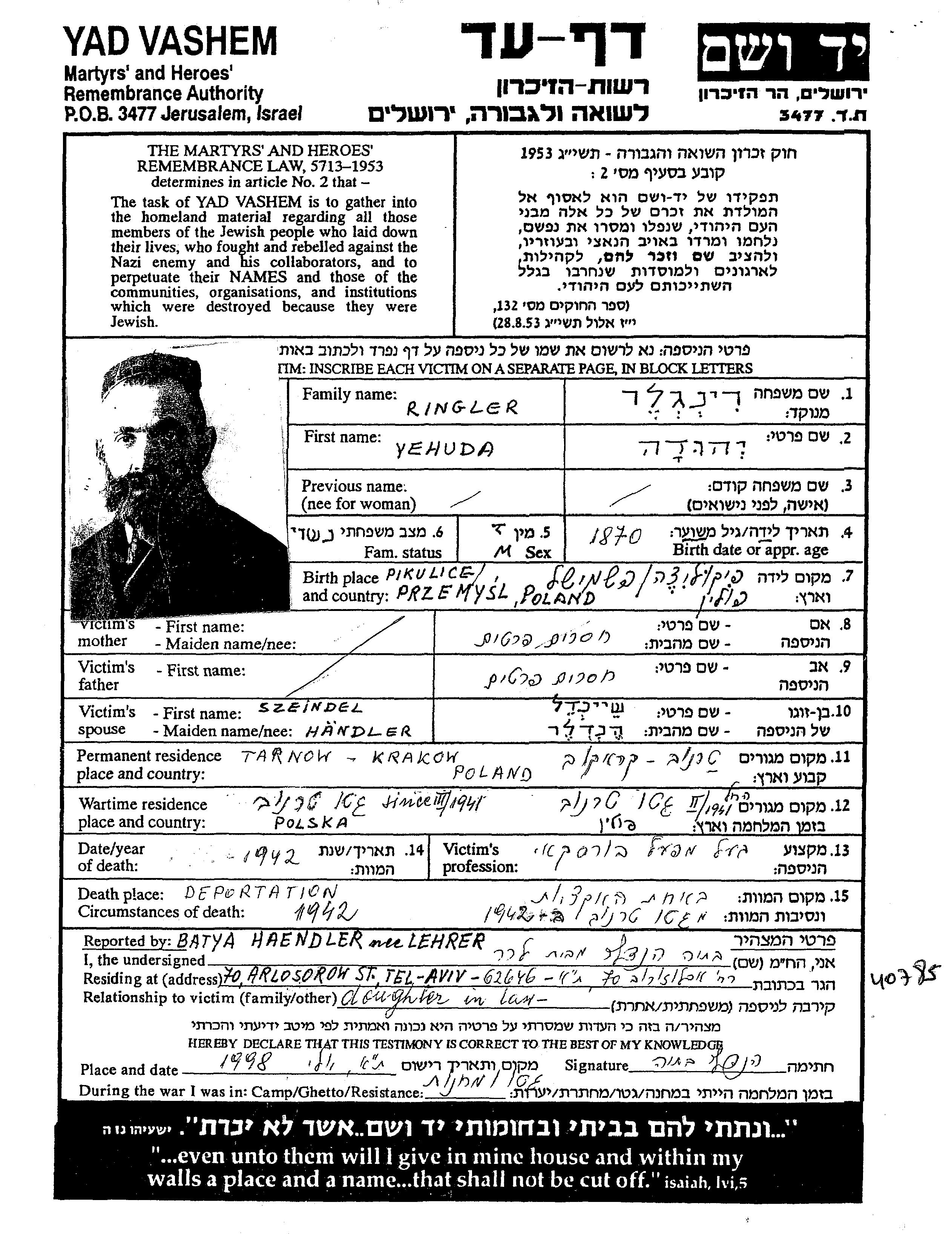 Yehuda Ringler wurde im Jahr 1870 in Przemysl, Polen geboren. Er war Fabrikant/-in. Vor dem Zweiten Weltkrieg lebte er in Tarnow, Polen.