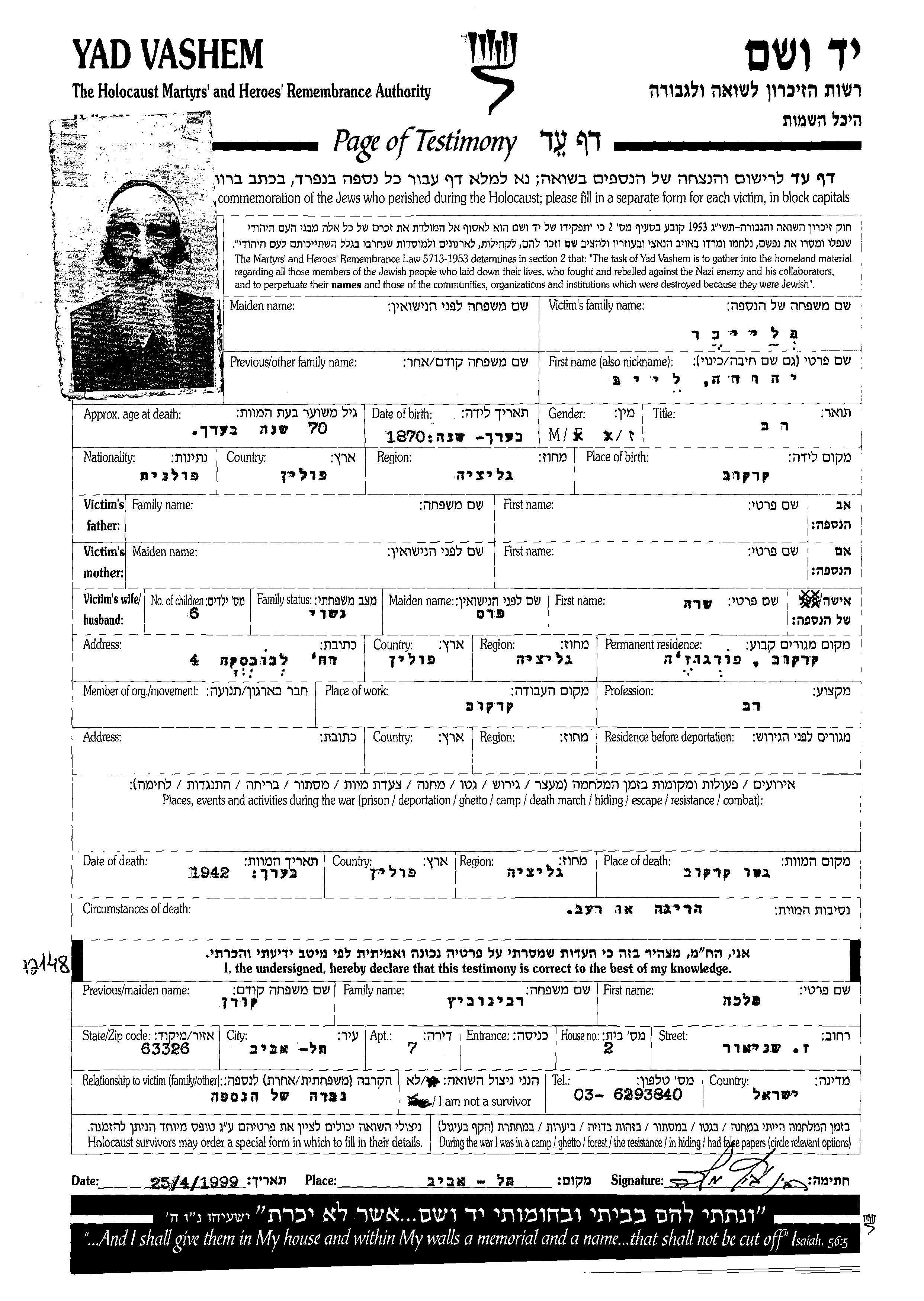 Yehuda Leib wurde in der Schoah ermordet. Todesort: Krakow, Polen im Jahr 1942.