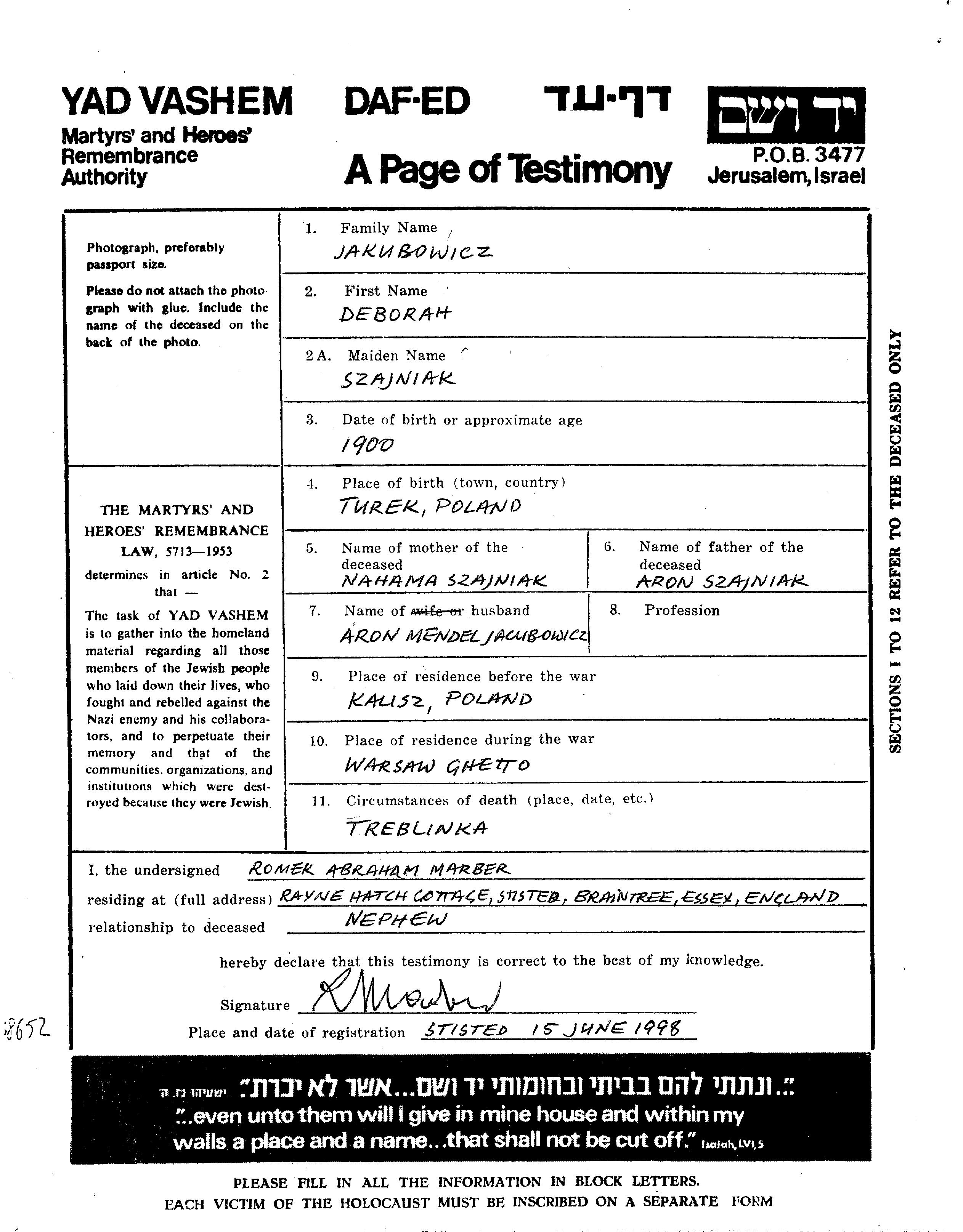 Deborah Jakubowicz, geb. Szajniak wurde im Jahr 1900 in Turek, Polen geboren. Vor dem Zweiten Weltkrieg lebte sie in Kalisz, Polen.