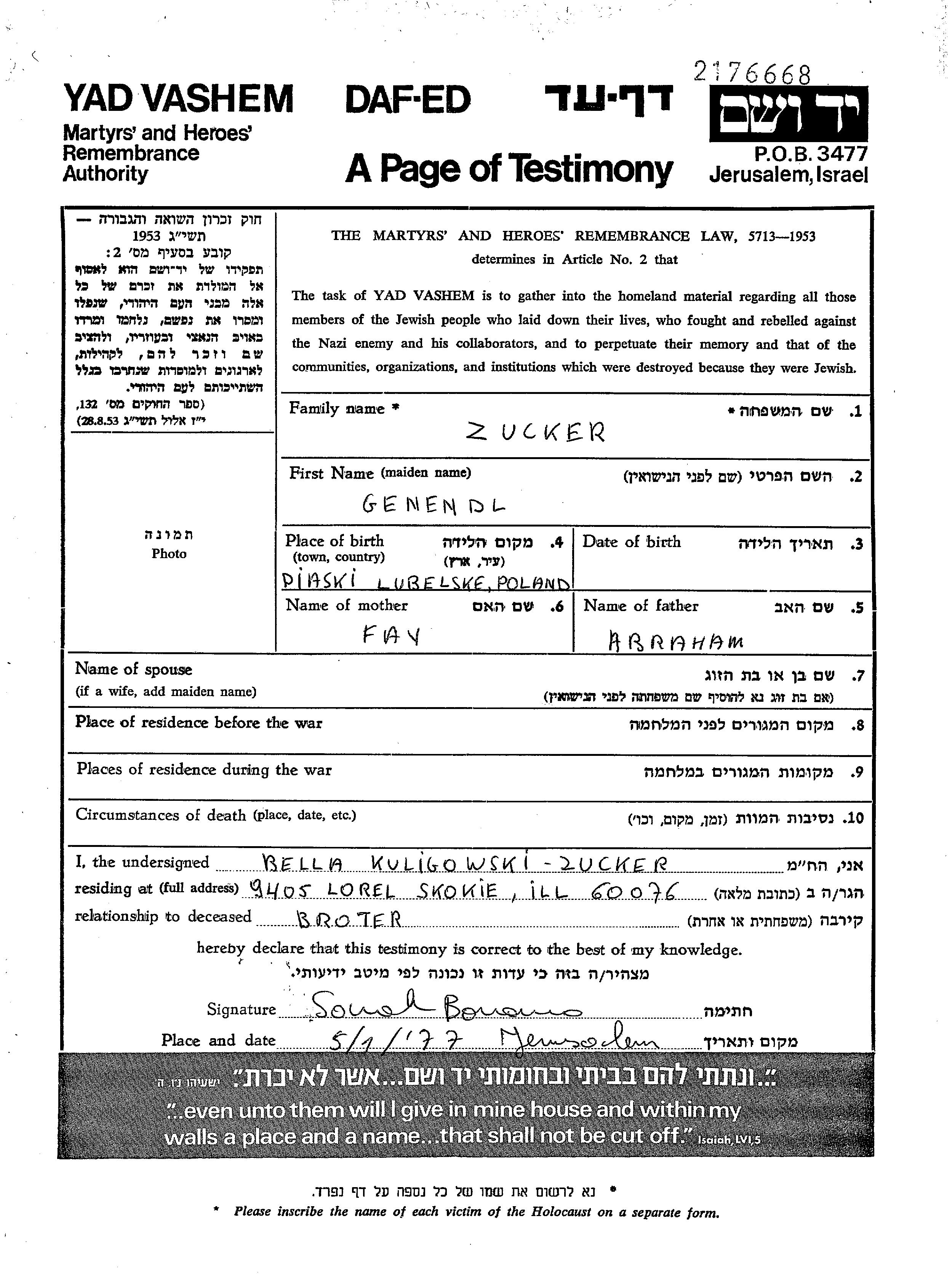 | Tzuker | Genendl | Piaski, Polen | Gedenkblatt | |
