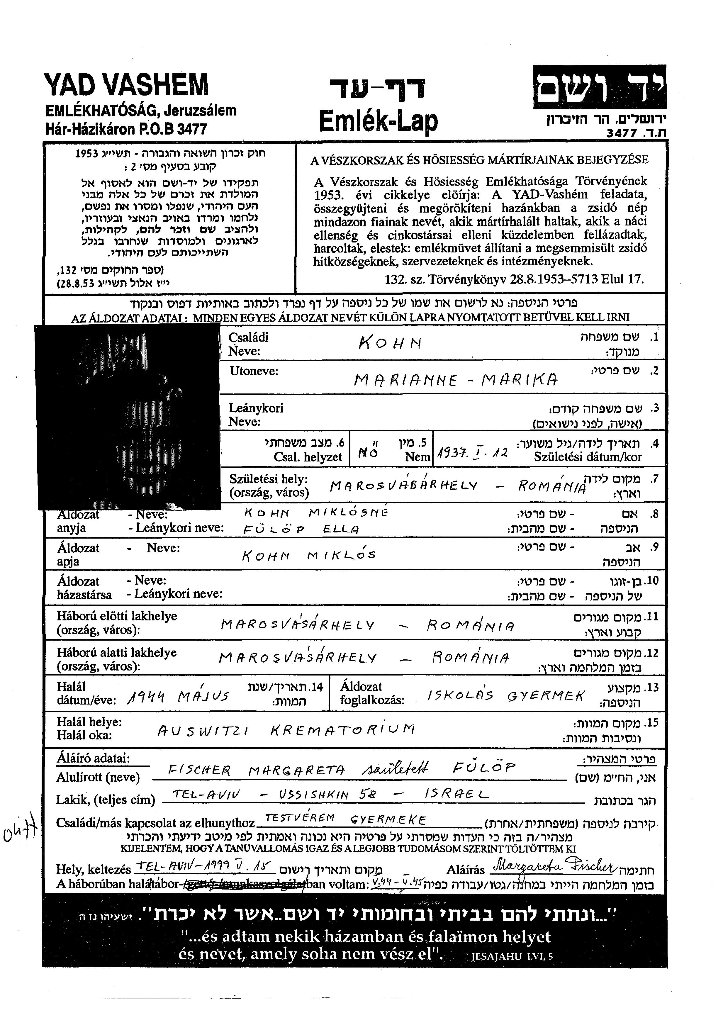 Kohn Marianne Marika 1937 Marosvarhely, Rumänien Gedenkblatt