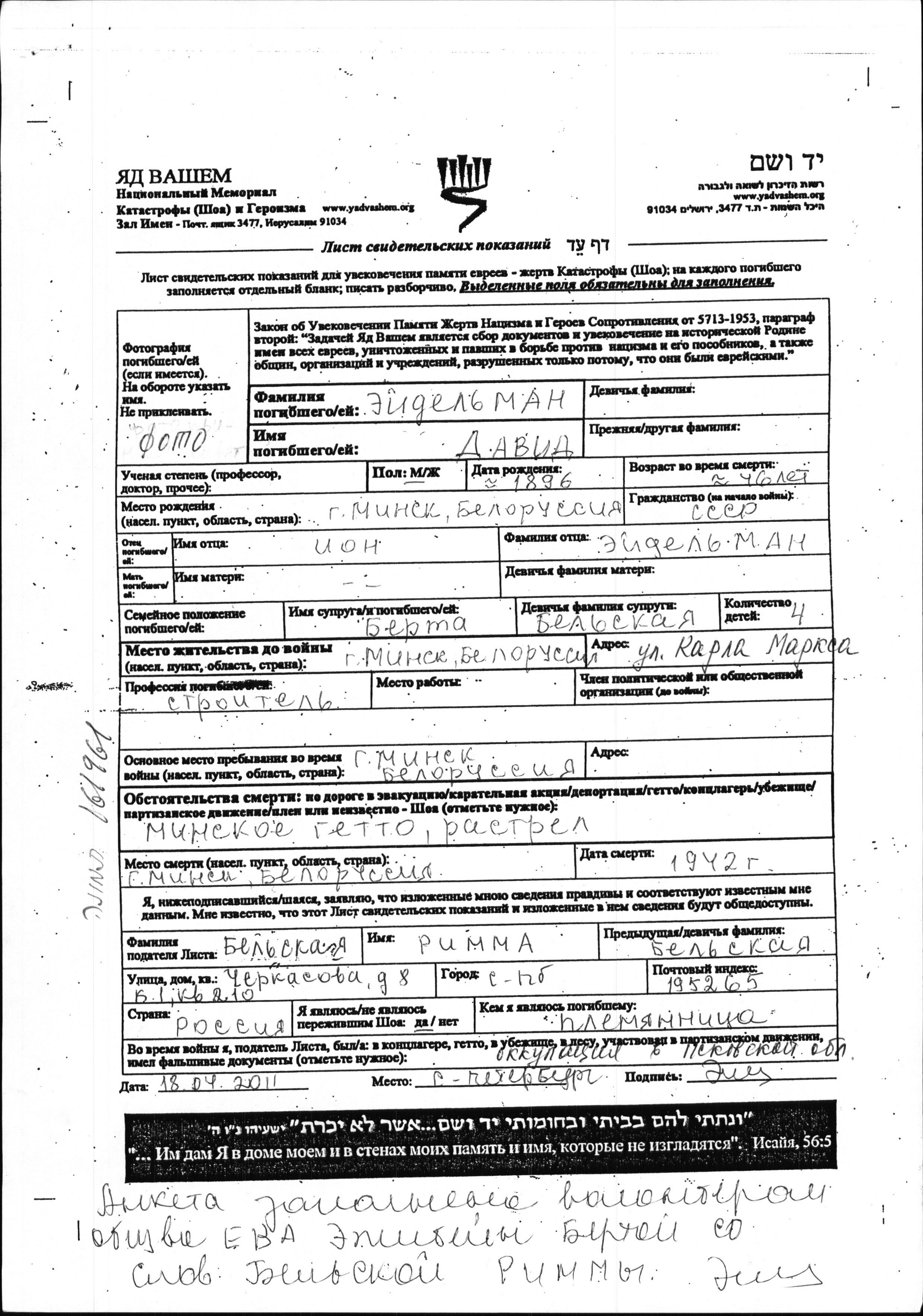 Eydelman | David | 1896 | Minsk, Weißrussland (UdSSR) | Gedenkblatt |