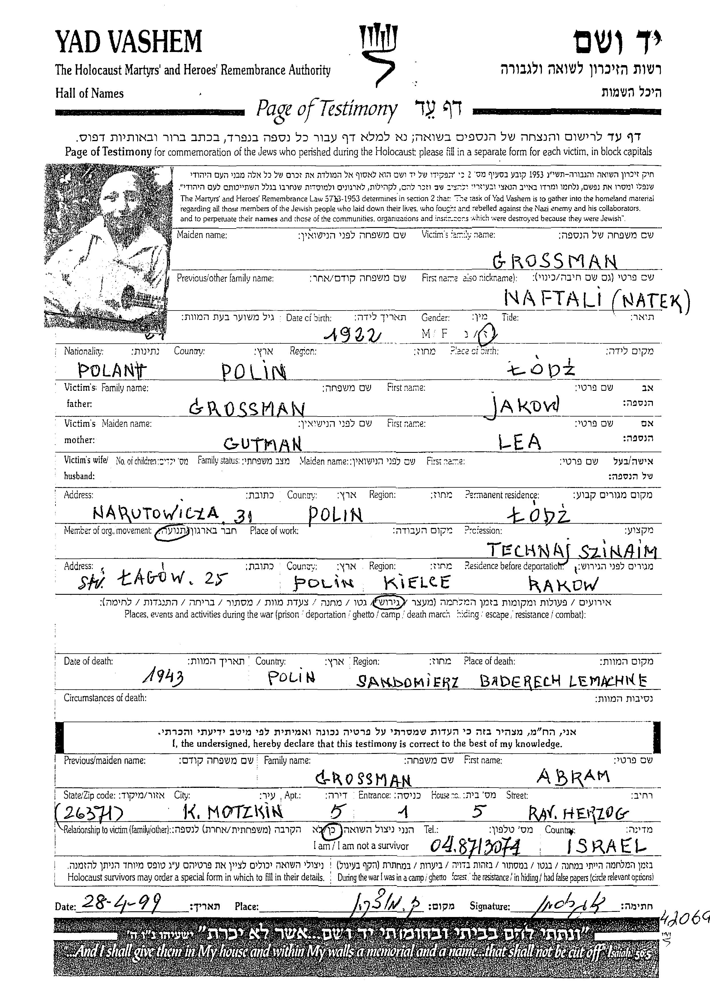 Grossman Naftali Natek 1922 Lodz, Polen Gedenkblatt