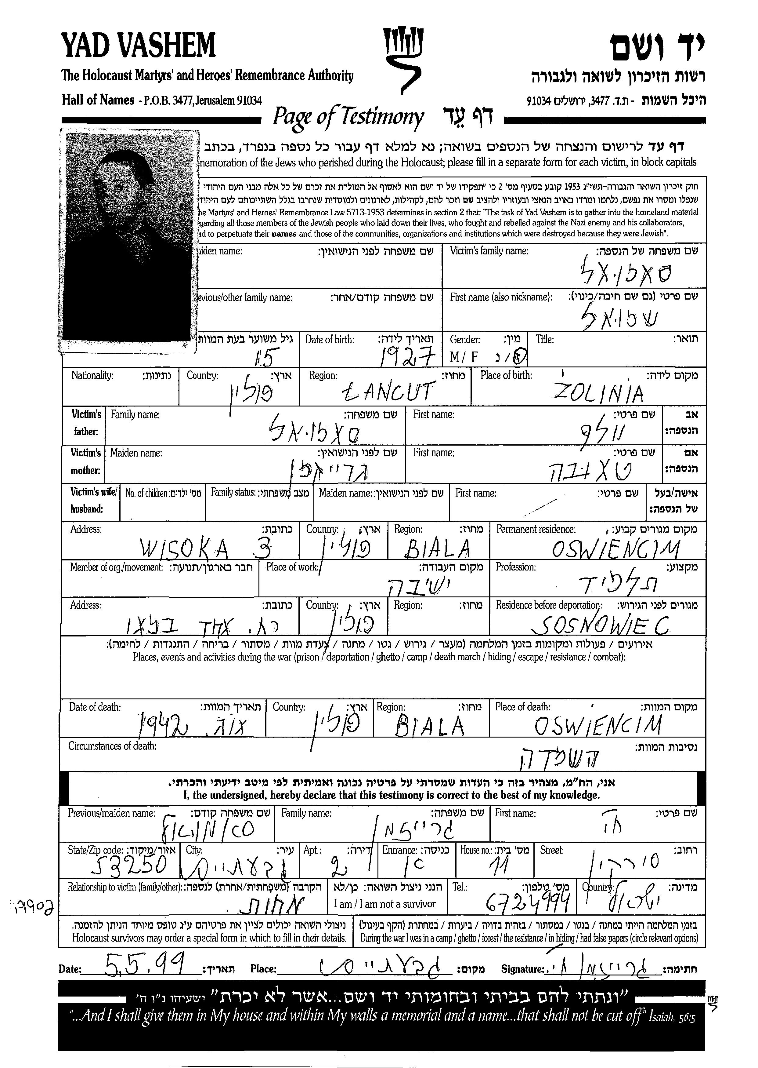 Shmuel Samuel wurde in Zolynia, Polen geboren. Er war Schüler/-in. Vor dem Zweiten Weltkrieg lebte er in Oświęcim, Polen.