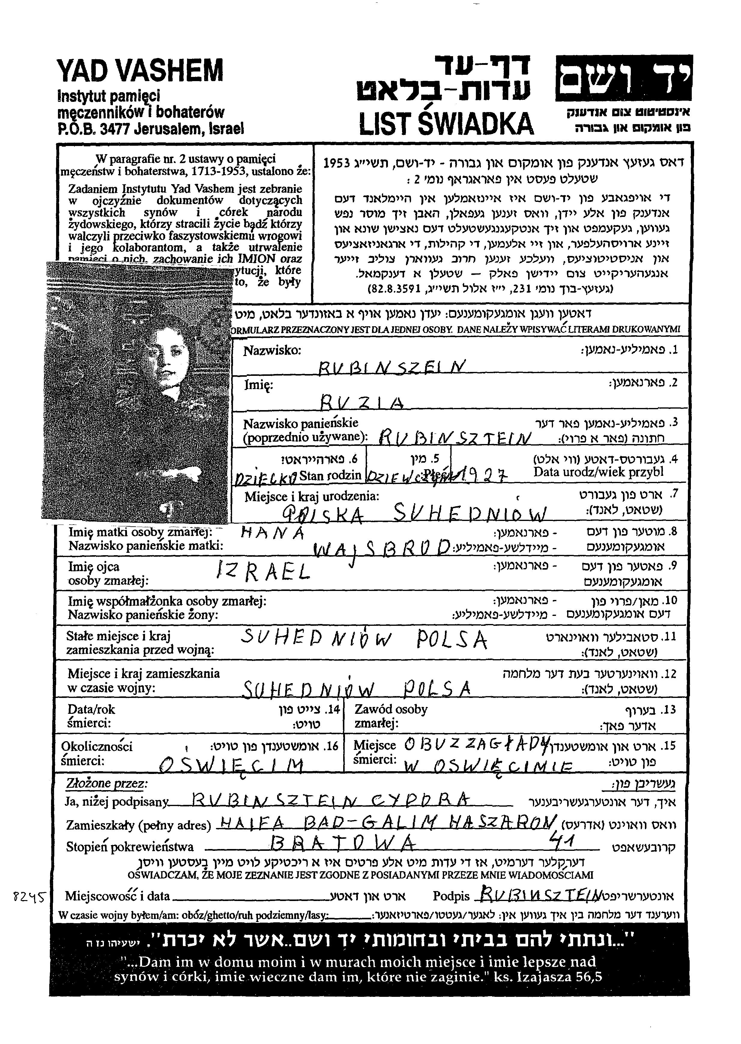 Ruzia Rubinsztein wurde im Jahr 1927 in Suchedniow, Polen geboren. Vor dem Zweiten Weltkrieg lebte sie in Suchedniow, Polen.