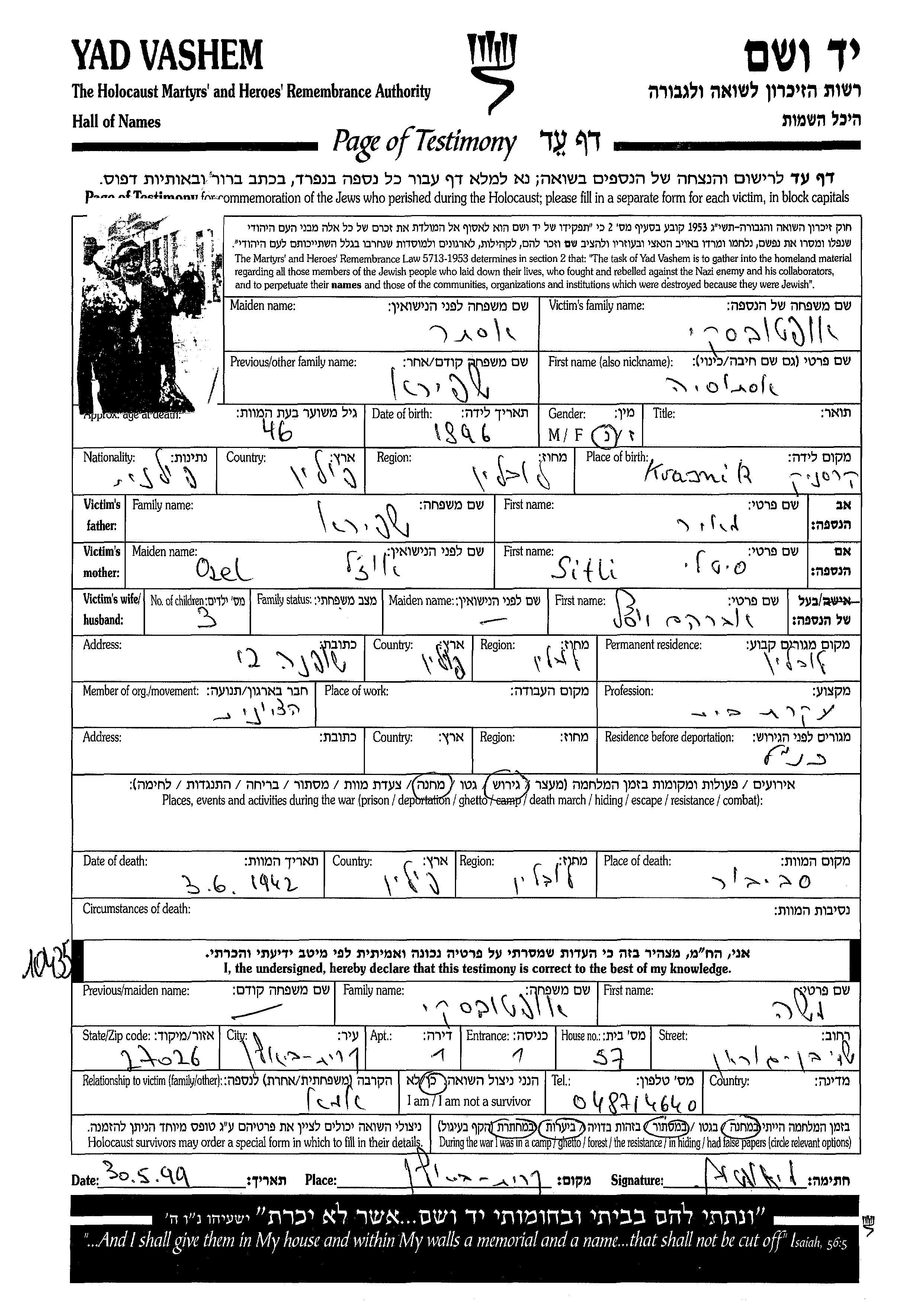Ester Opatovski, geb. Shapira wurde im Jahr 1896 in Krašnik, Polen geboren. Sie war Hausfrau. Vor dem Zweiten Weltkrieg lebte sie in Lublin, Polen.