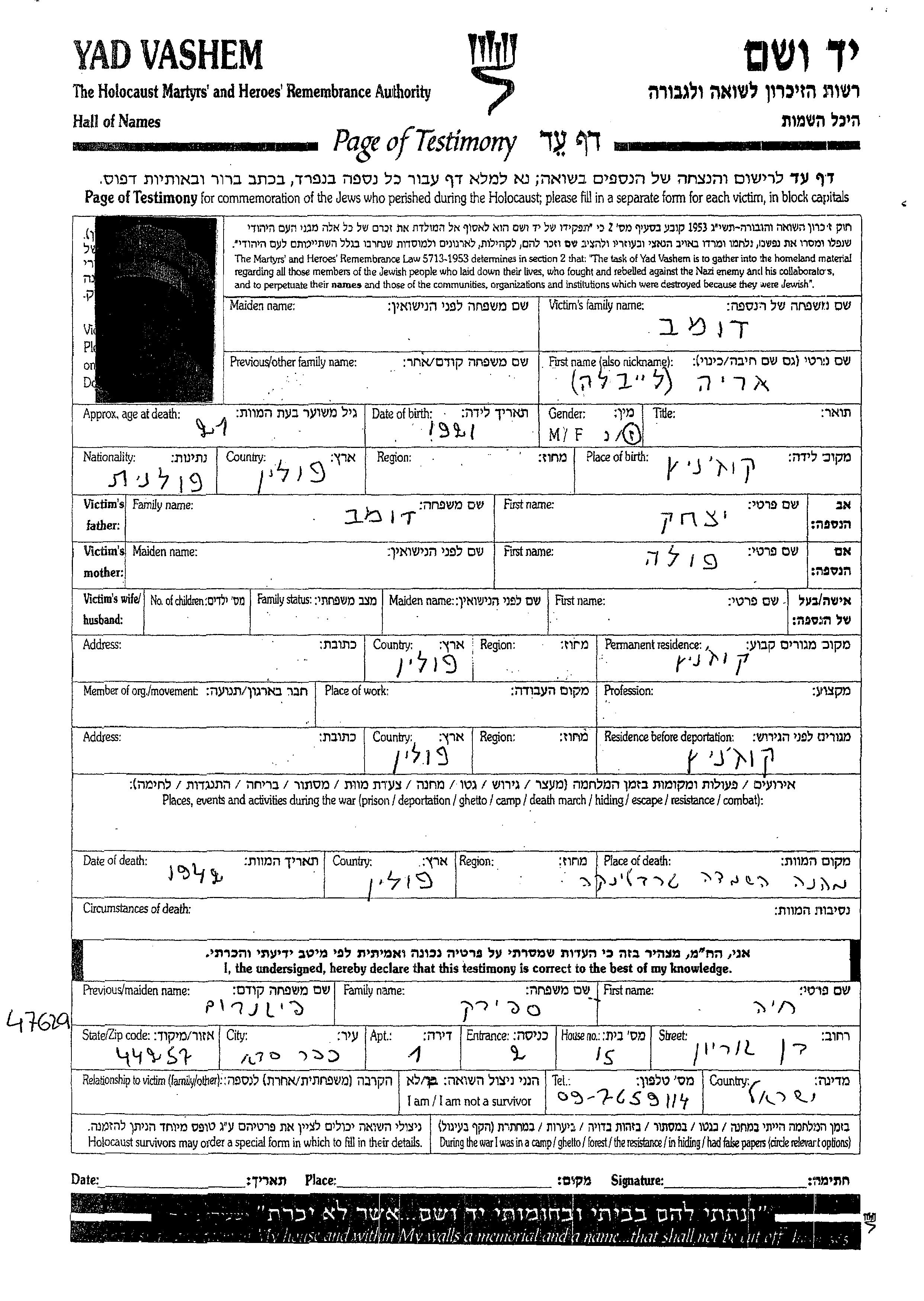 Arie Leibele Domb wurde im Jahr 1921 in Kozienice, Polen geboren. Vor dem Zweiten Weltkrieg lebte er in Kozienice, Polen.