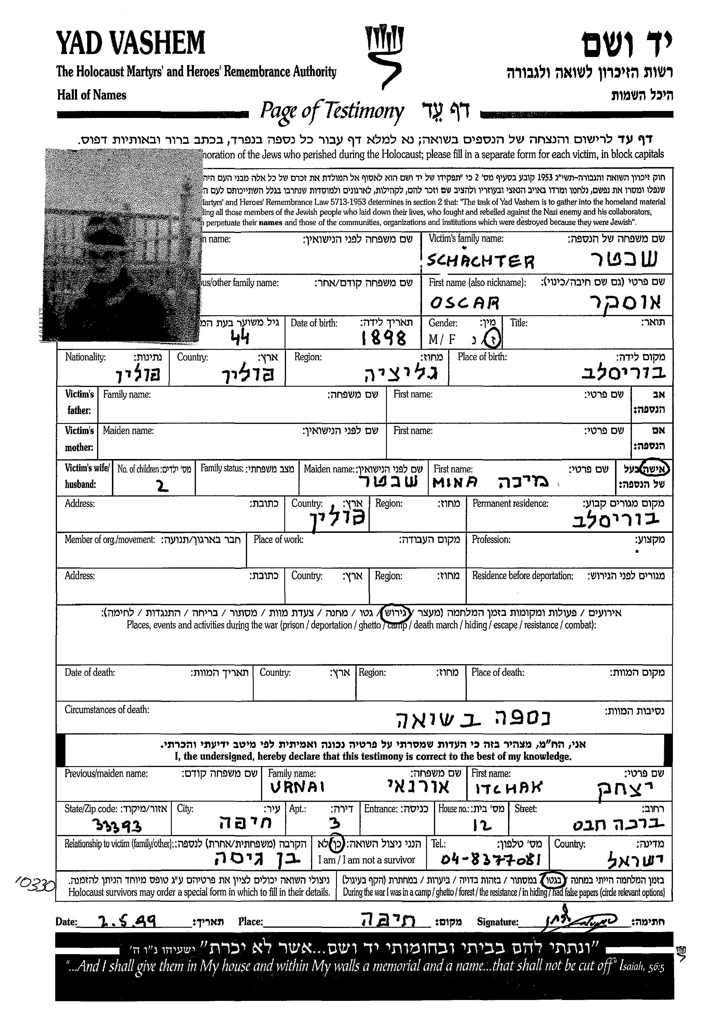 Oscar Schächter wurde im Jahr 1898 in Boryslaw, Polen geboren. Vor dem Zweiten Weltkrieg lebte er in Boryslaw, Polen.