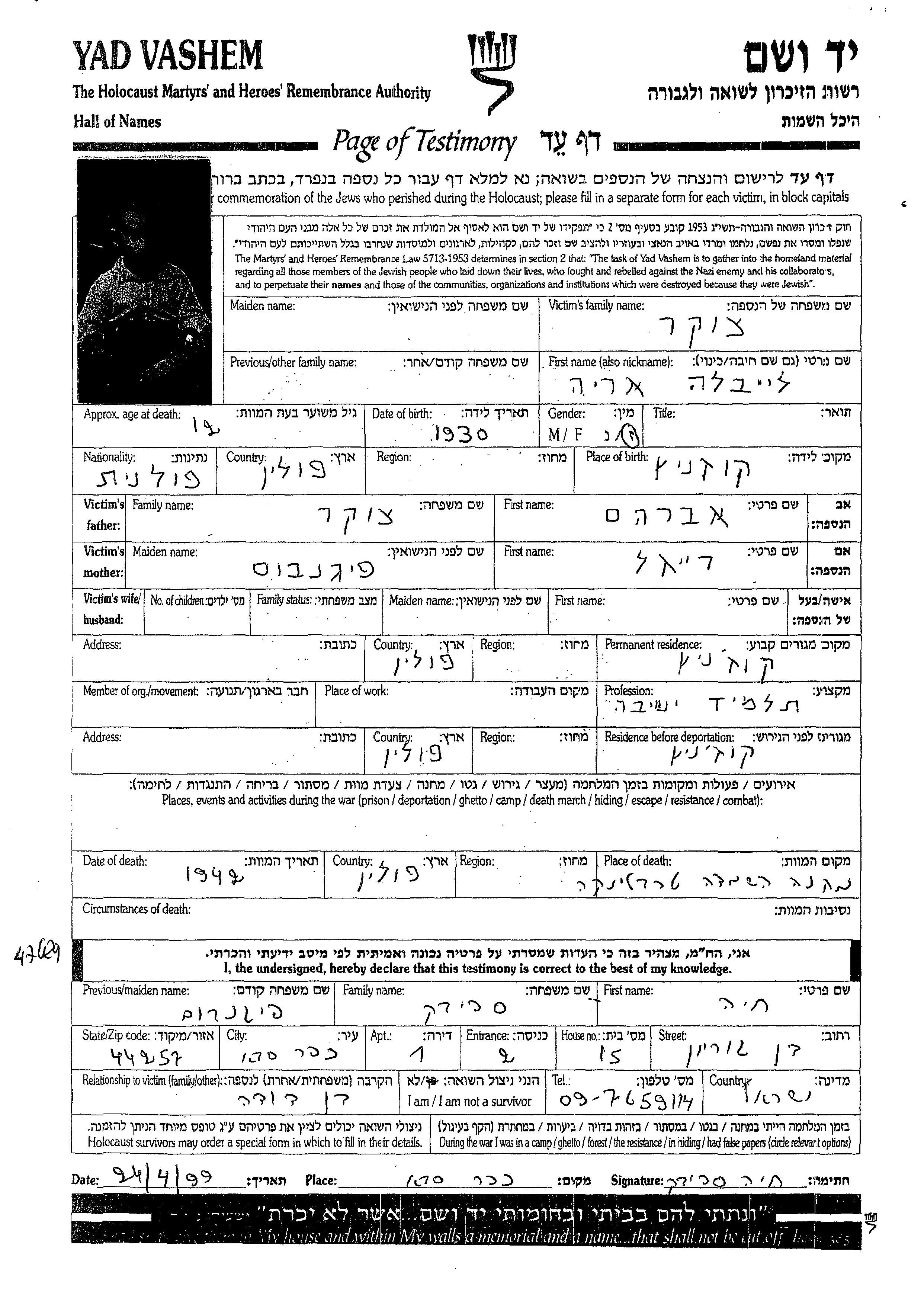 Leibele Arie Tzuker wurde im Jahr 1930 in Kozienice, Polen geboren. Er war Jeschiwahschüler. Vor dem Zweiten Weltkrieg lebte er in Kozienice, Polen.