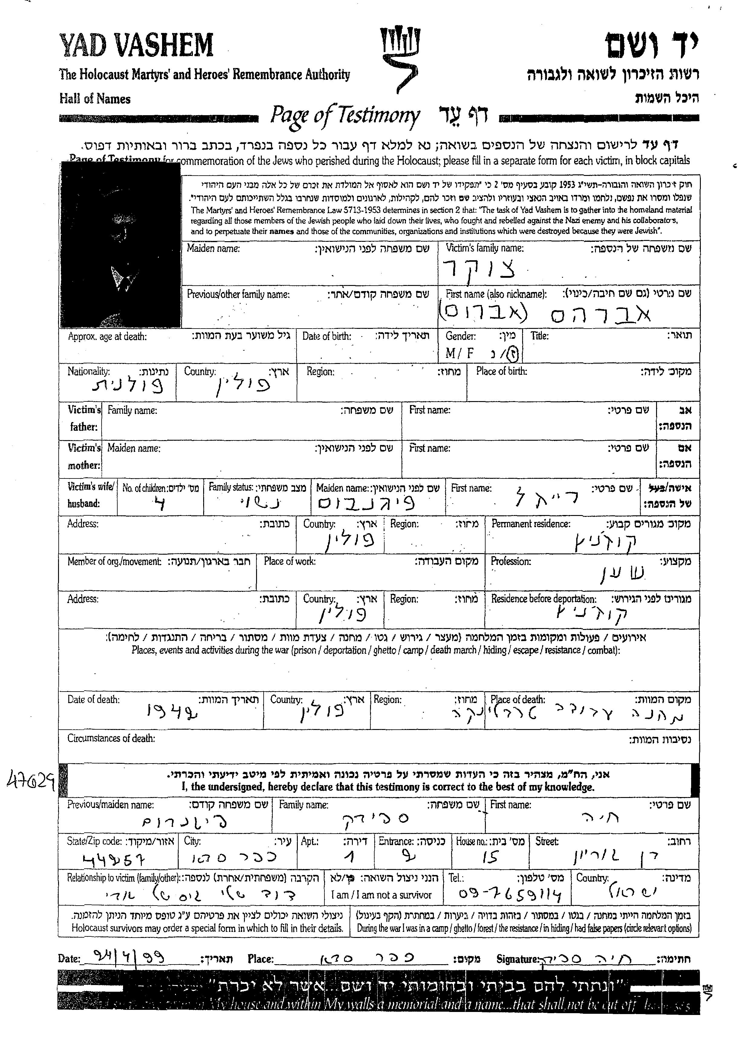 Avraham wurde in der Schoah ermordet. Todesort: Treblinka, Polen im Jahr 1942.