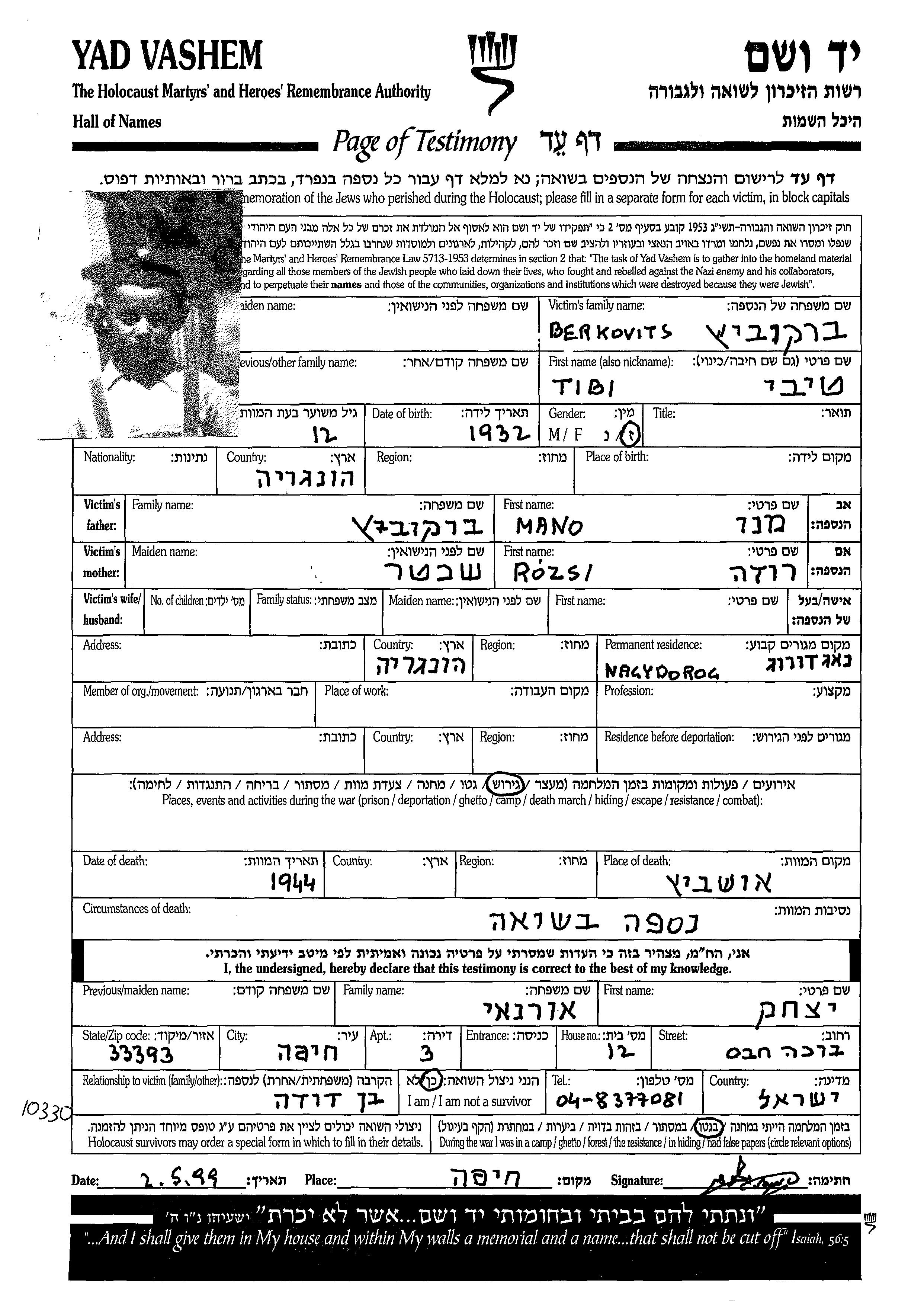 Tibi wurde in der Schoah ermordet. Todesort: Auschwitz, Polen im Jahr 1944.