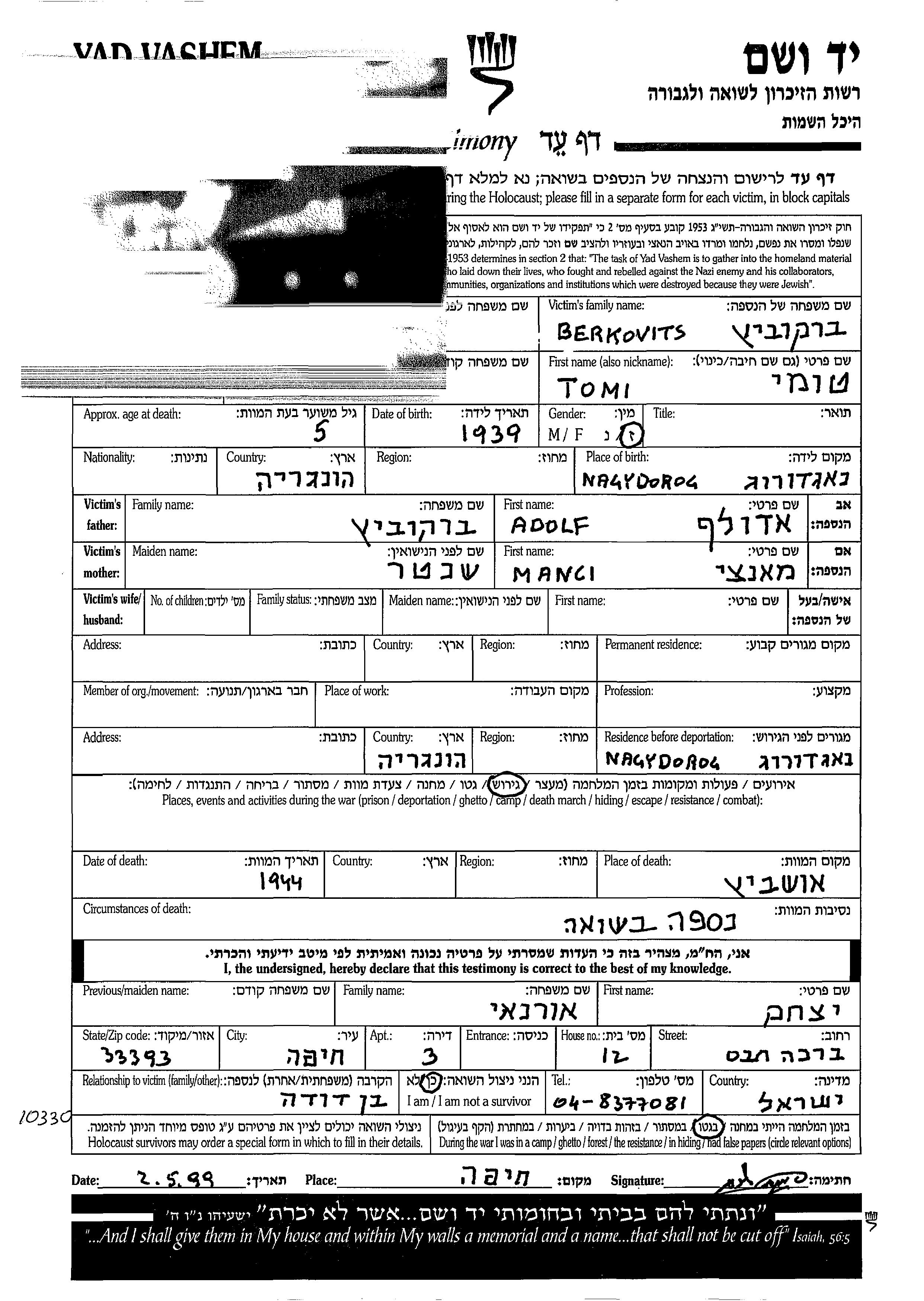 Tomi wurde in der Schoah ermordet. Todesort: Auschwitz, Polen im Jahr 1944.