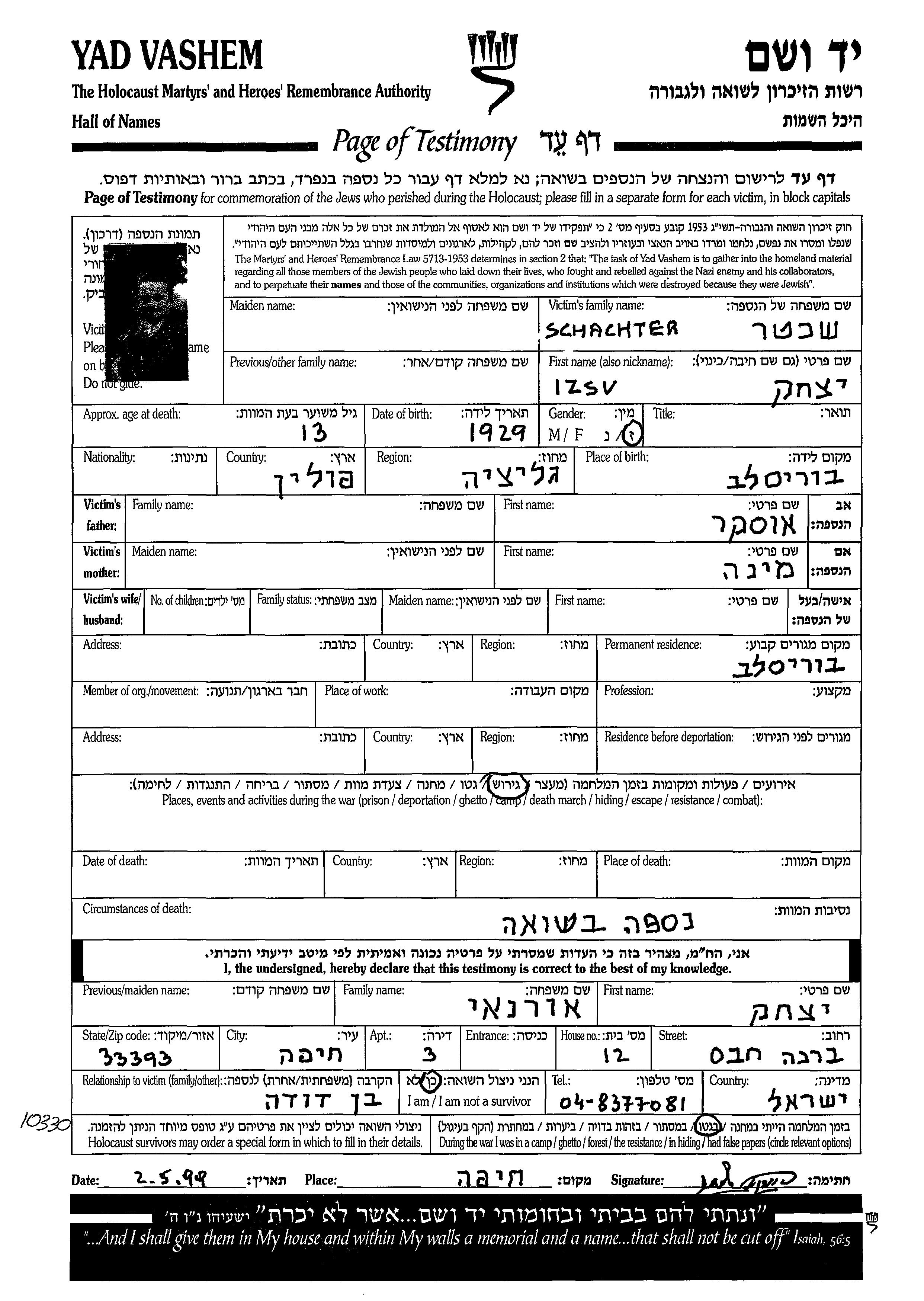 Izsu Yitzkhak Schachter wurde im Jahr 1929 in Boryslaw, Polen geboren. Vor dem Zweiten Weltkrieg lebte er in Boryslaw, Polen.