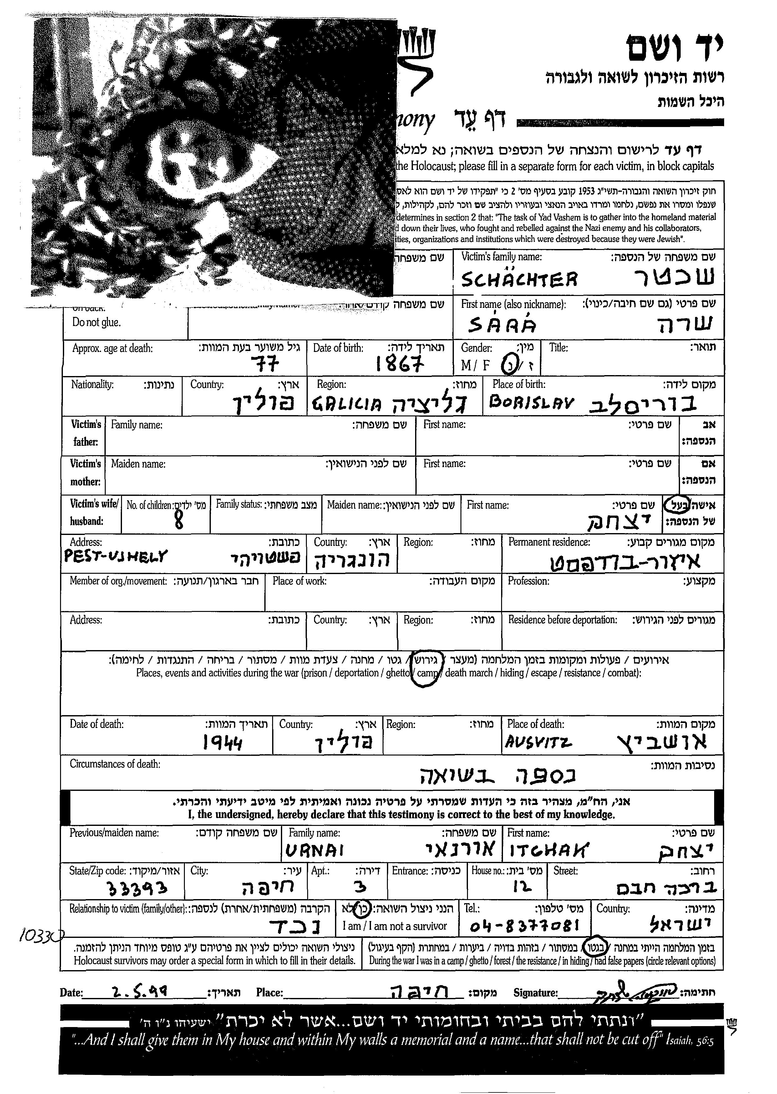 Sara Schächter wurde im Jahr 1867 in Boryslaw, Polen geboren. Vor dem Zweiten Weltkrieg lebte sie in Budapest, Ungarn.