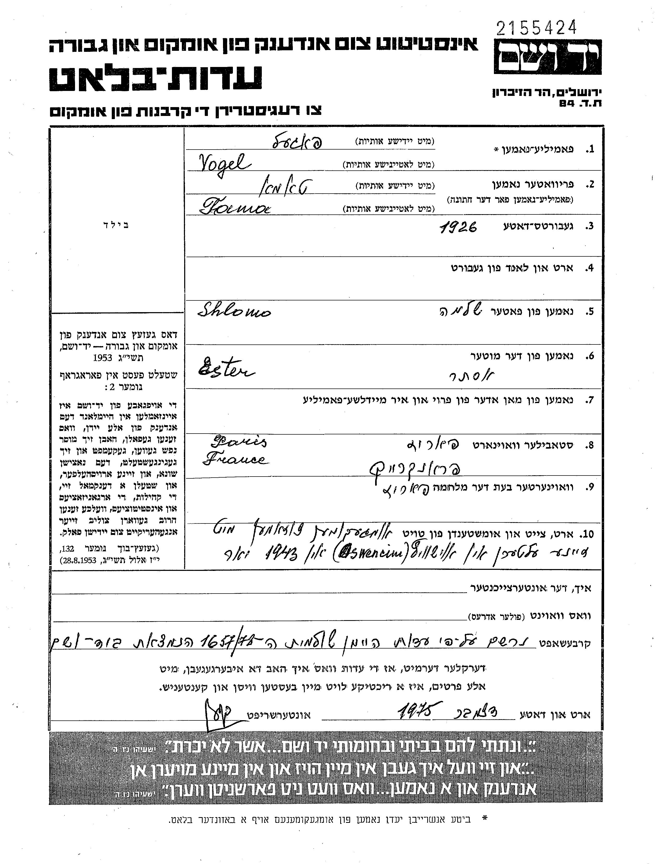Tama Tema Vogel wurde im Jahr 1926 geboren. Er/sie war der/ die Sohn/Tochter von Shlomo und Ester. Vor dem Zweiten Weltkrieg er/sie in Paris, Frankreich. Während des Krieges war er/sie in Paris, Frankreich.