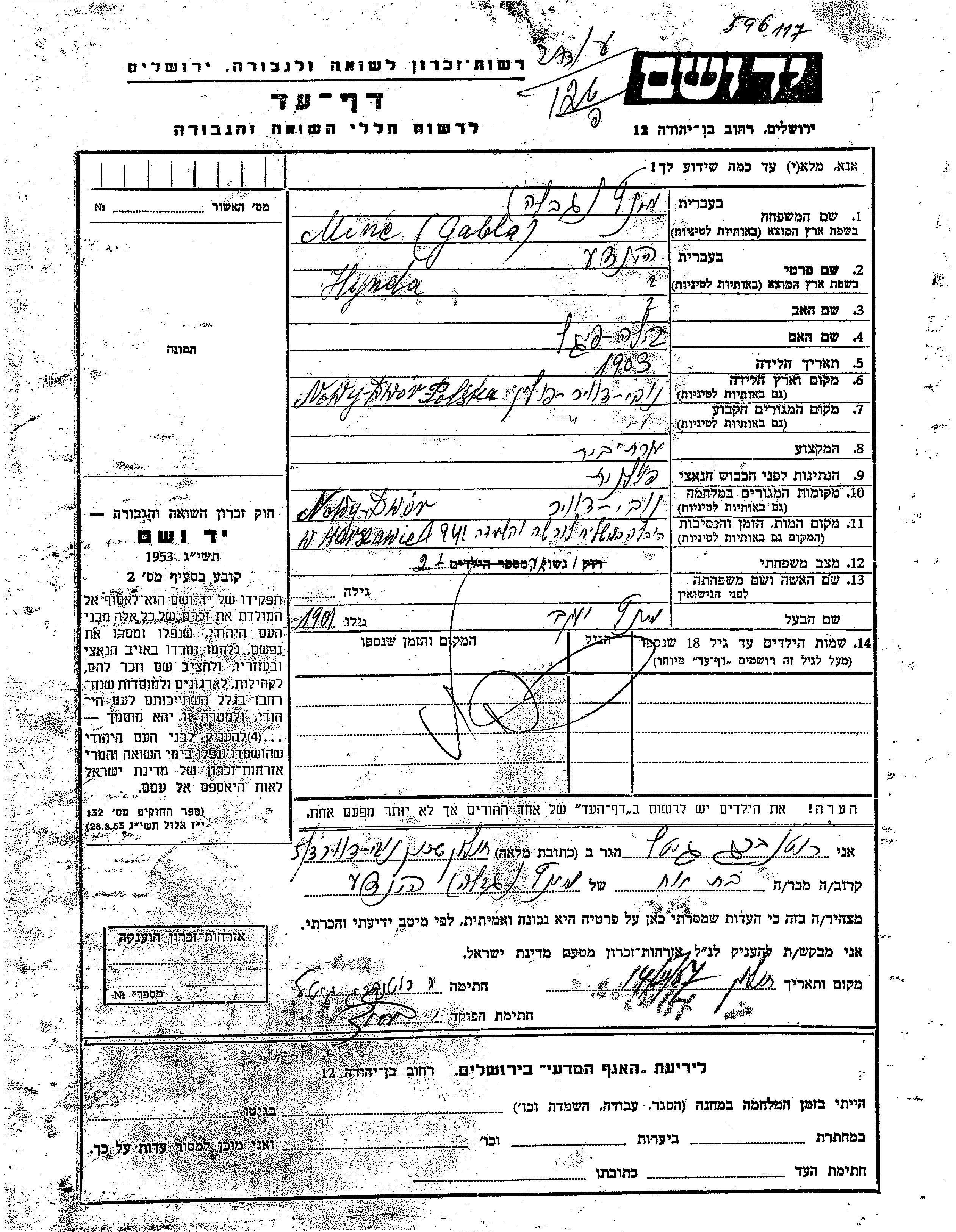 Hynda Minc, geb. Gabla wurde im Jahr 1903 in Nowy Dwor, Polen geboren. Sie war die Tochter von Bila Feigl. Sie war Hausfrau und mit Yaakov Verheiratet. Vor dem Zweiten Weltkrieg lebte sie in Nowy Dwor, Polen. Während des Krieges war sie in Nowy Dwor, Polen.