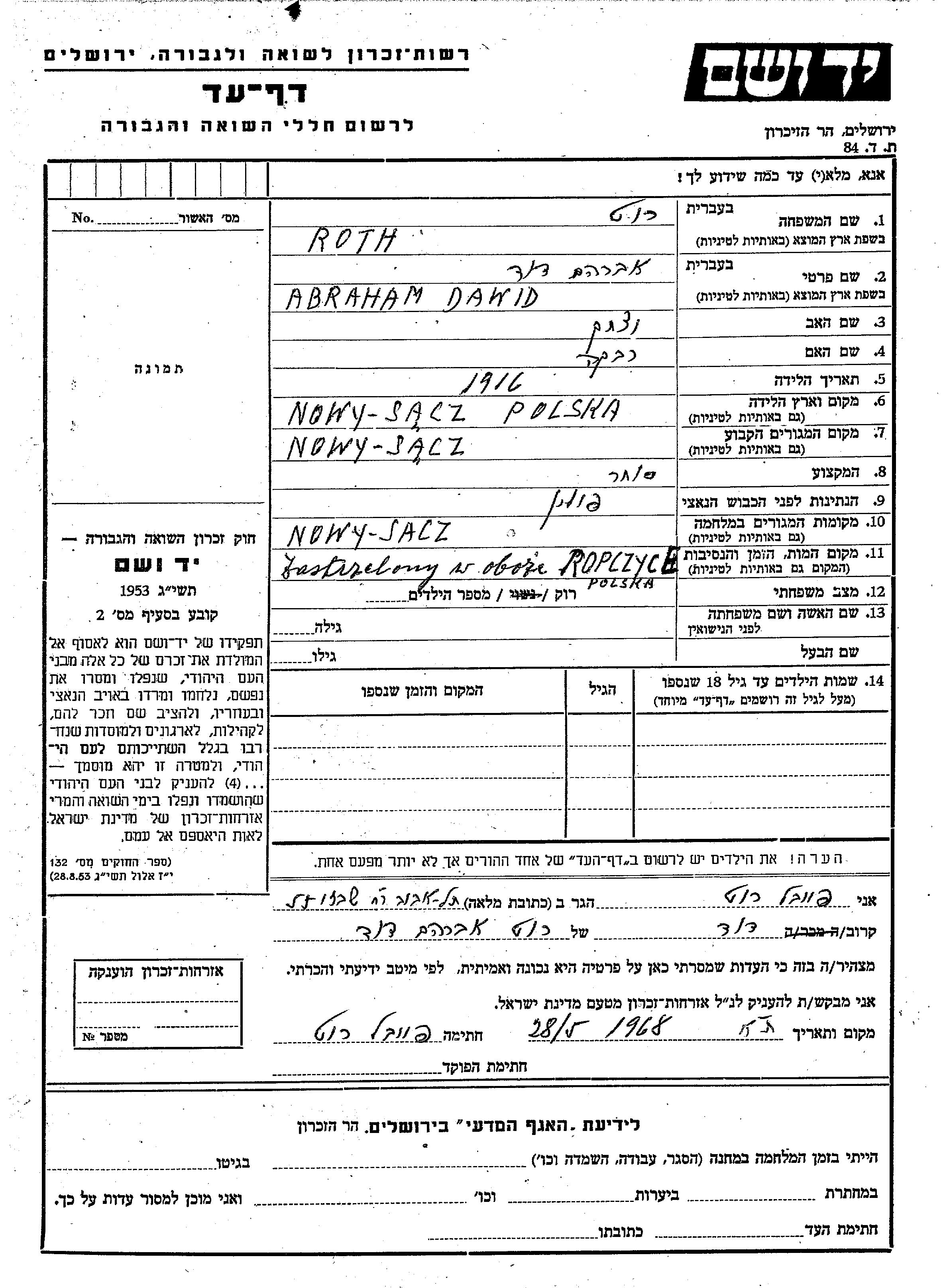 Roth Rut Abraam Dawid 1916 Nowy Sacz, Polen Gedenkblatt