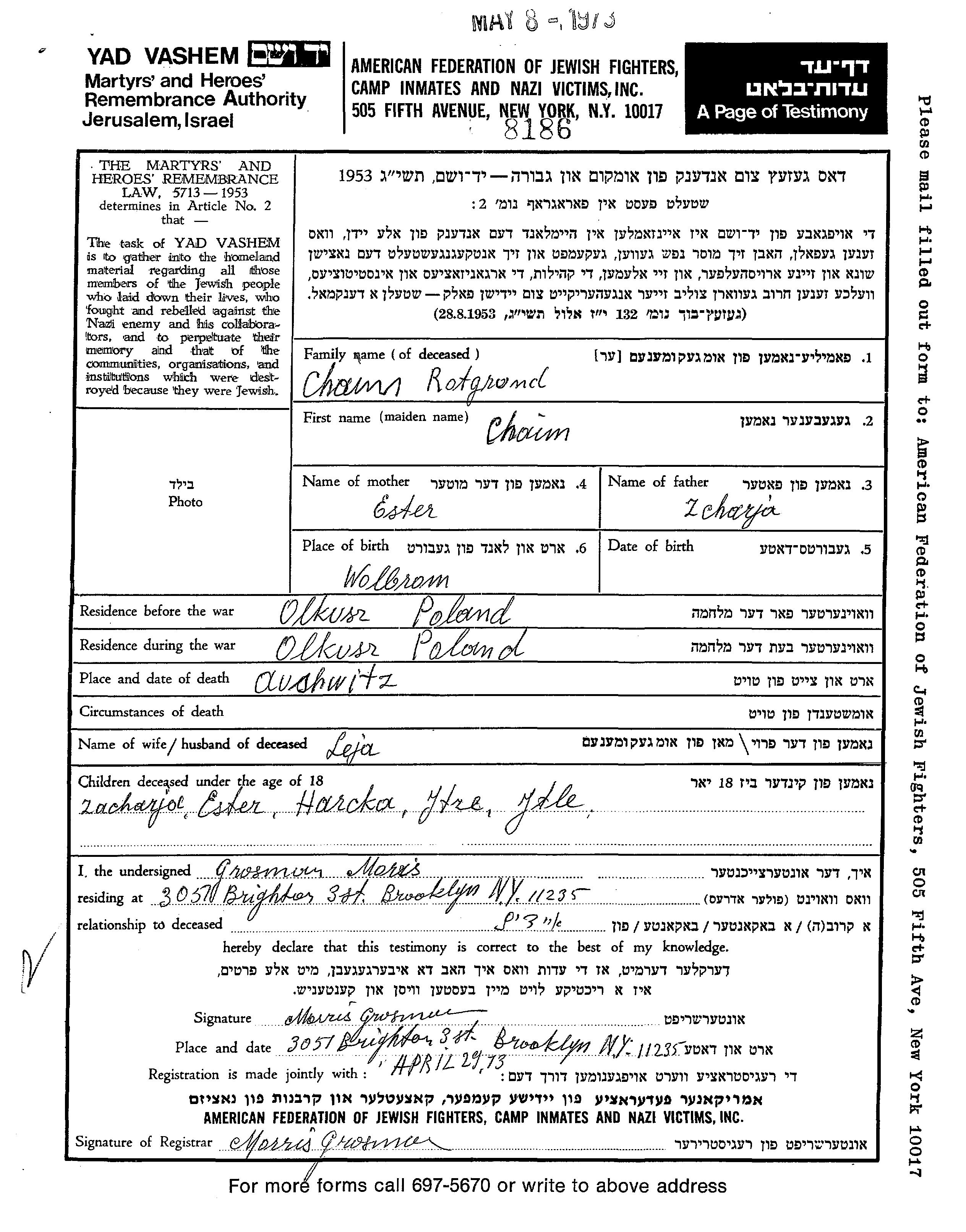 Chaim Rotgrund wurde in Wolbrom, Polen geboren. Er war der Sohn von Zeharya und Ester. Vor dem Zweiten Weltkrieg lebte er in Olkusz, Polen. Während des Krieges war er in Olkusz, Polen.