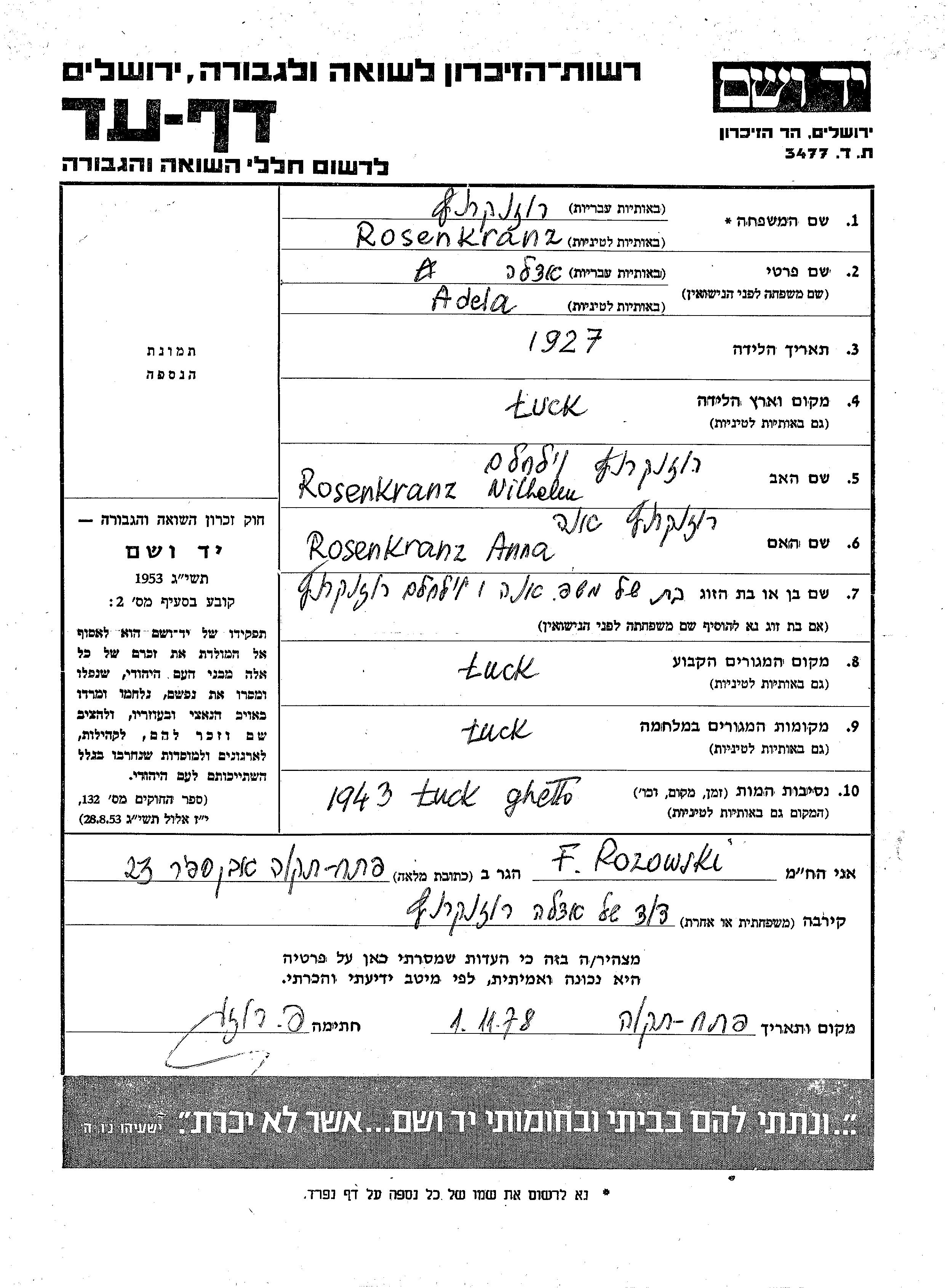 Adela Rosenkranz wurde im Jahr 1927 in Luck, Polen geboren. Sie war die Tochter von Vilkhelm und Anna. Vor dem Zweiten Weltkrieg lebte sie in Luck, Polen. Während des Krieges war sie in Luck, Polen.