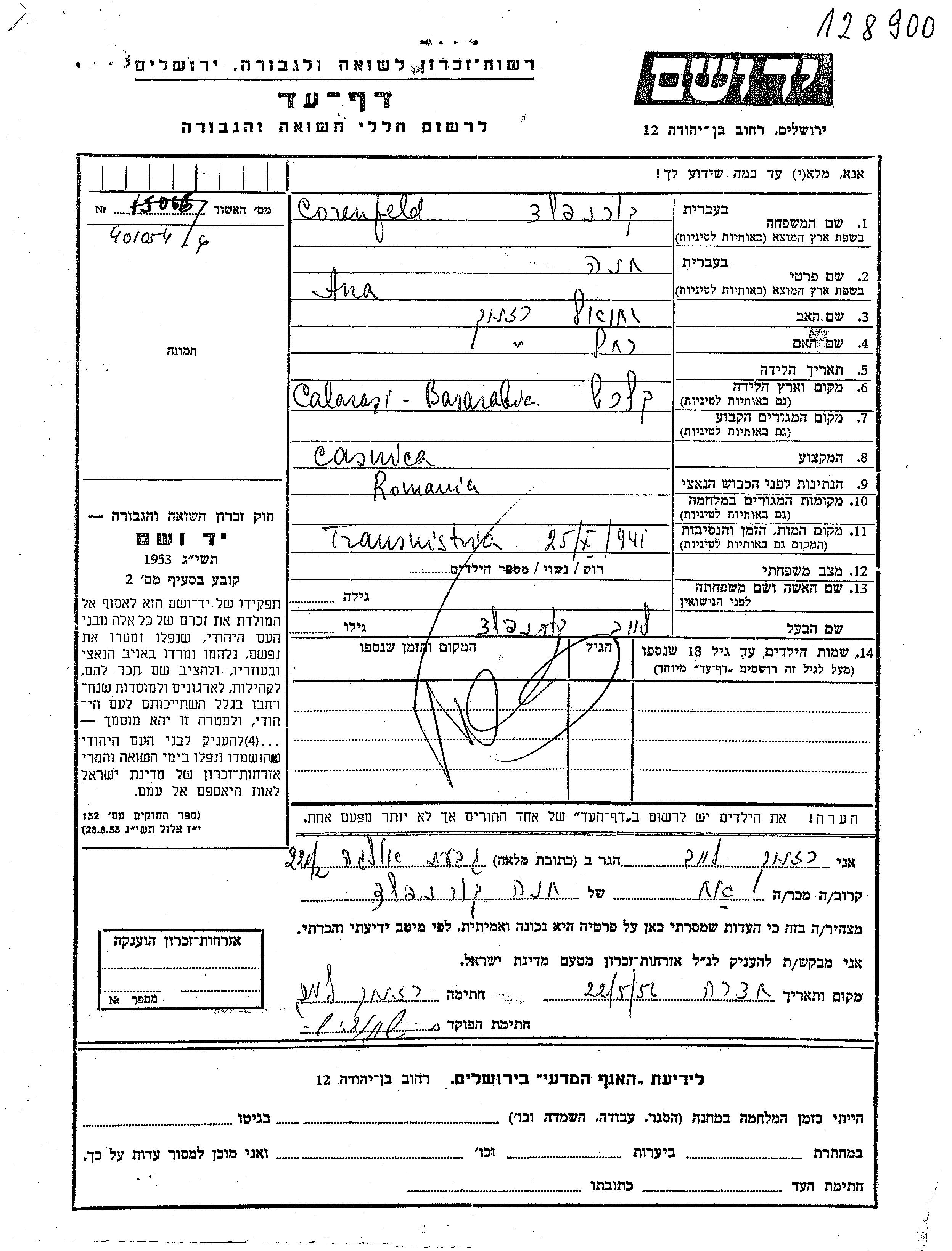Ana Khana Corenfeld, geb. Reznik wurde in Calaras, Rumänien geboren. Sie war die Tochter von Yekhiel und Rakhel. Sie war Hausfrau und mit Leib Verheiratet. Während des Krieges war sie in Rumänien.