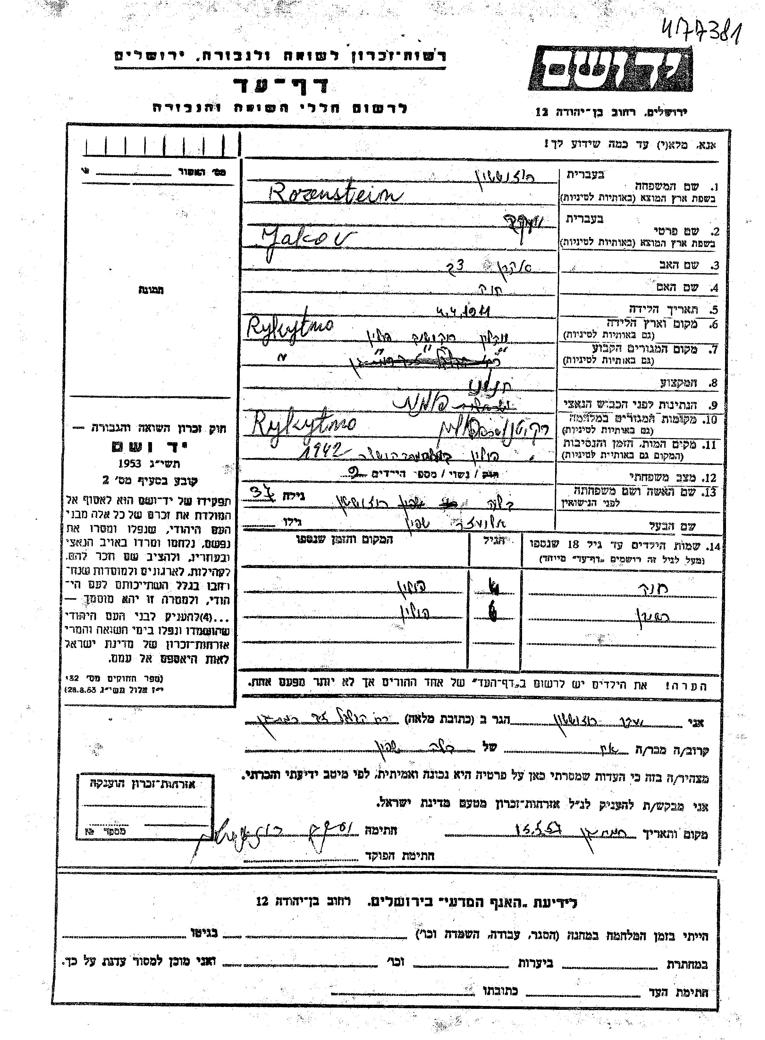 Rozenstein Eliezer 1911 Rokitno, Polen Gedenkblatt