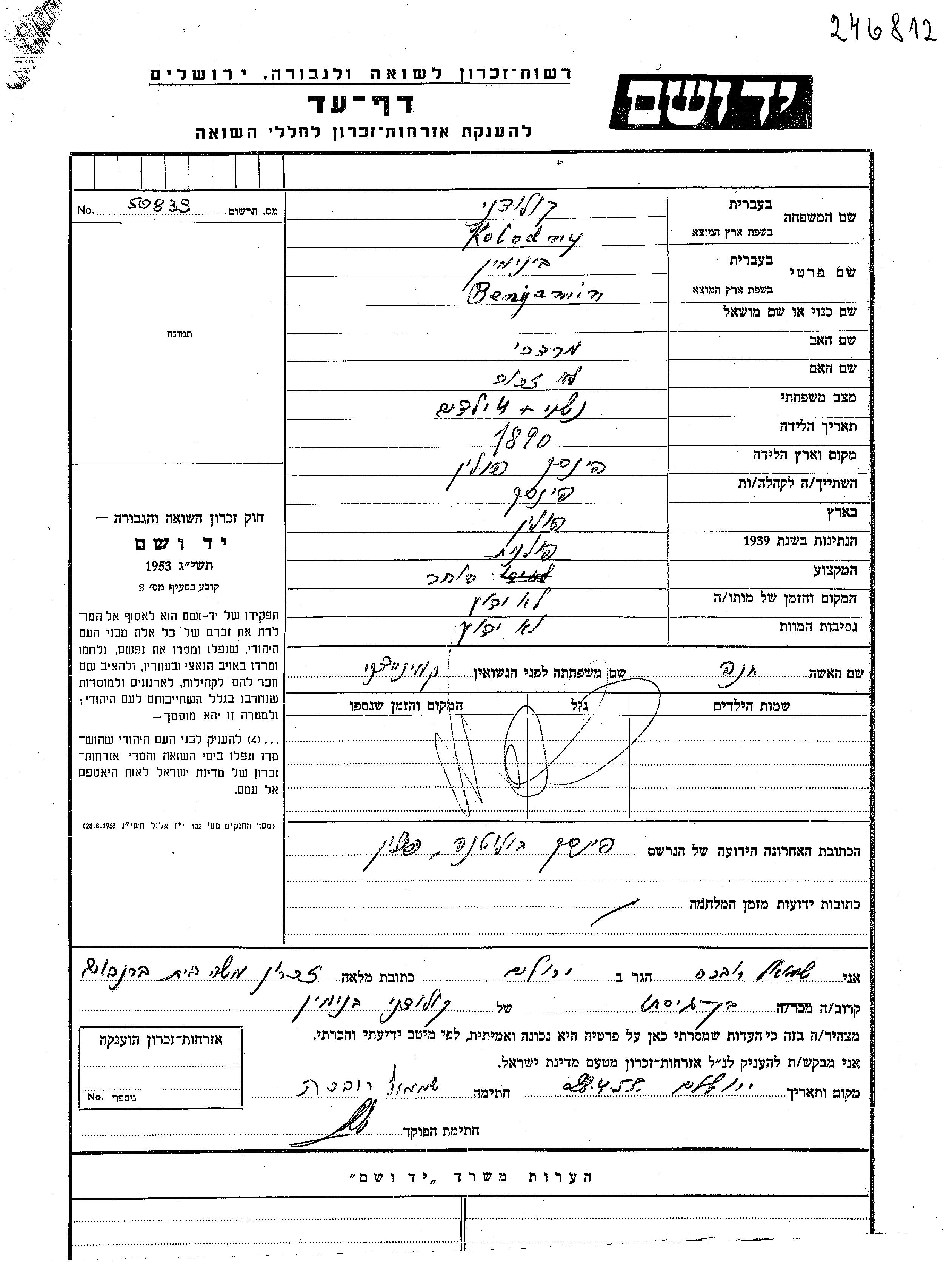 Benjamin Kolodny wurde im Jahr 1890 in Pinsk, Polen geboren. Er war der Sohn von Mordekhai. Er war Kaufmann/-frau und Verheiratet. Vor dem Zweiten Weltkrieg lebte er in Pinsk, Polen.