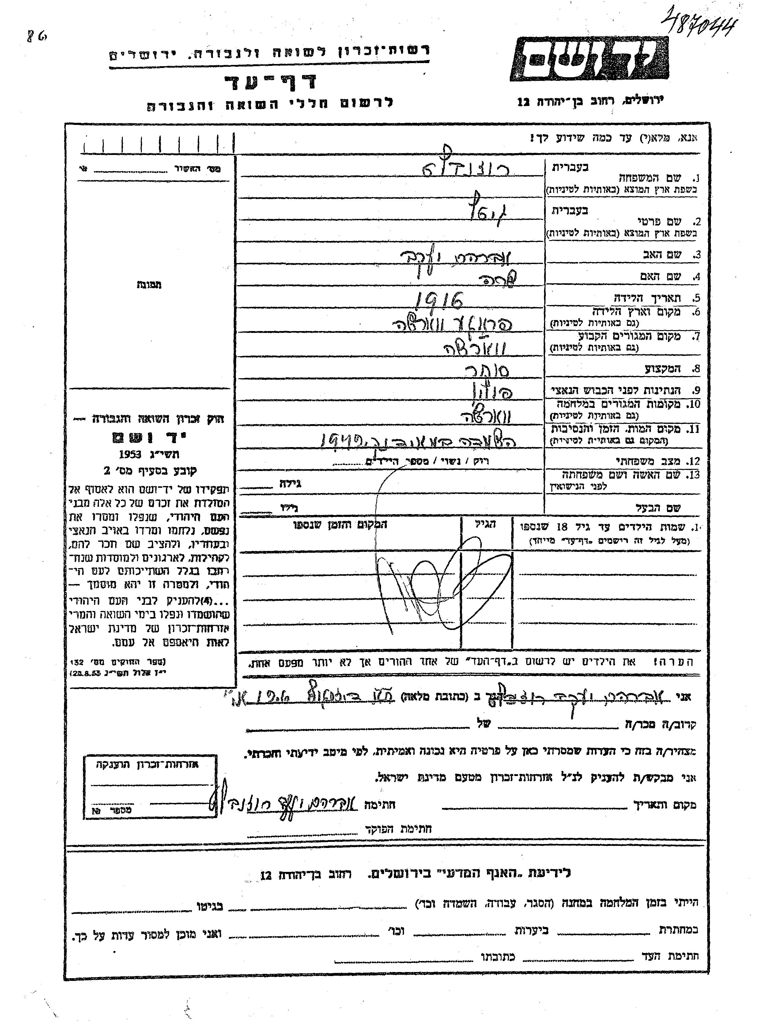 Gitel Rozenblat wurde im Jahr 1916 in Warsaw, Polen geboren. Sie war die Tochter von Avraham Yaakov und Sara. Sie war Kaufmann/-frau. Vor dem Zweiten Weltkrieg lebte sie in Warsaw, Polen. Während des Krieges war sie in Warsaw, Polen.
