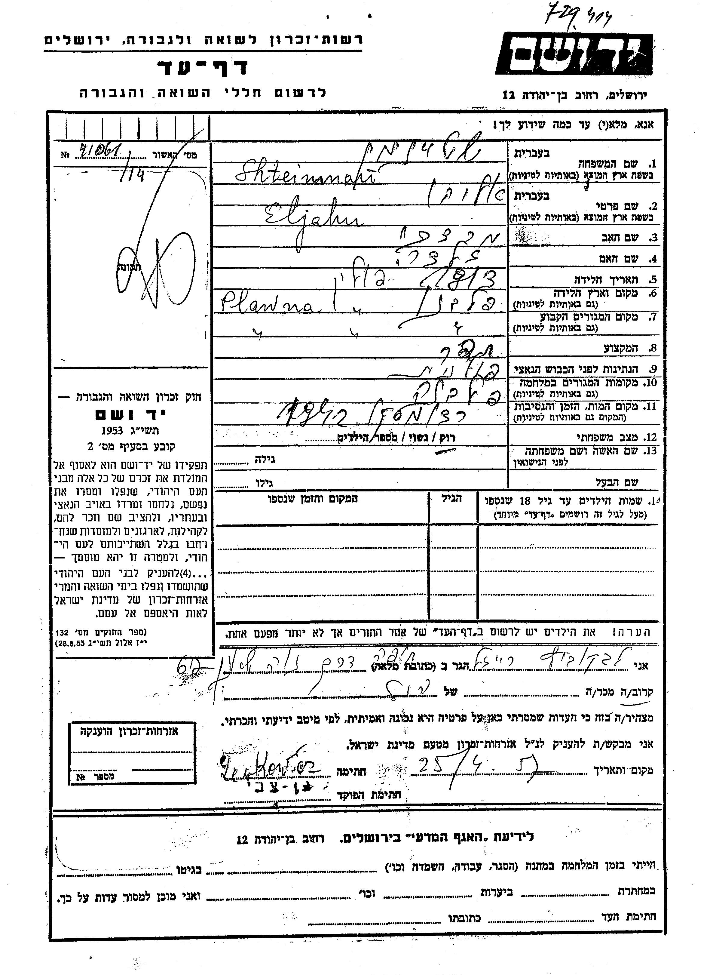 Eljahu wurde in der Schoah ermordet. Todesort: Radomsko, Strafanstalt im Jahr 1942.