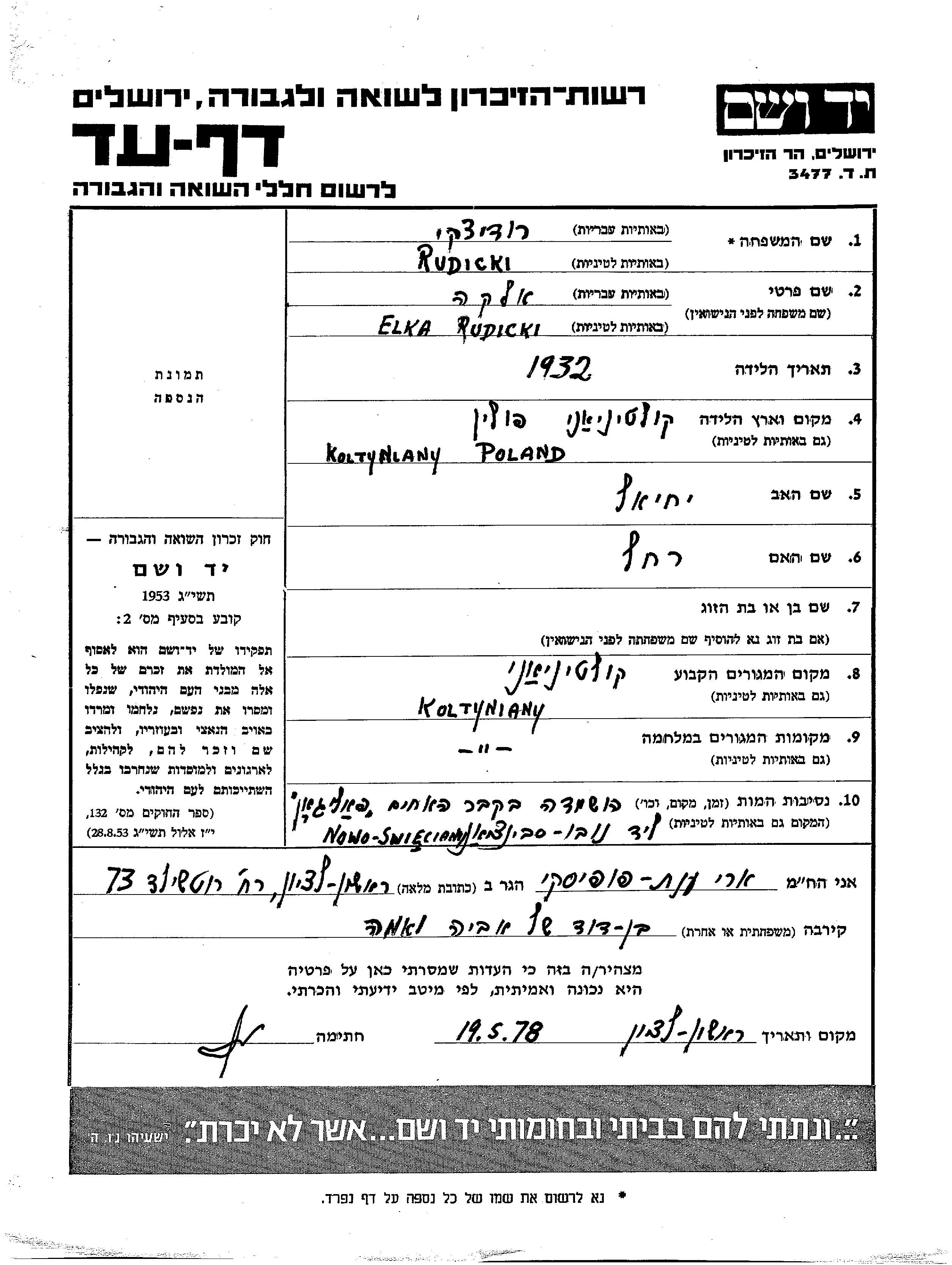 Rudicki Elka 1932 Koltyniany, Gedenkblatt