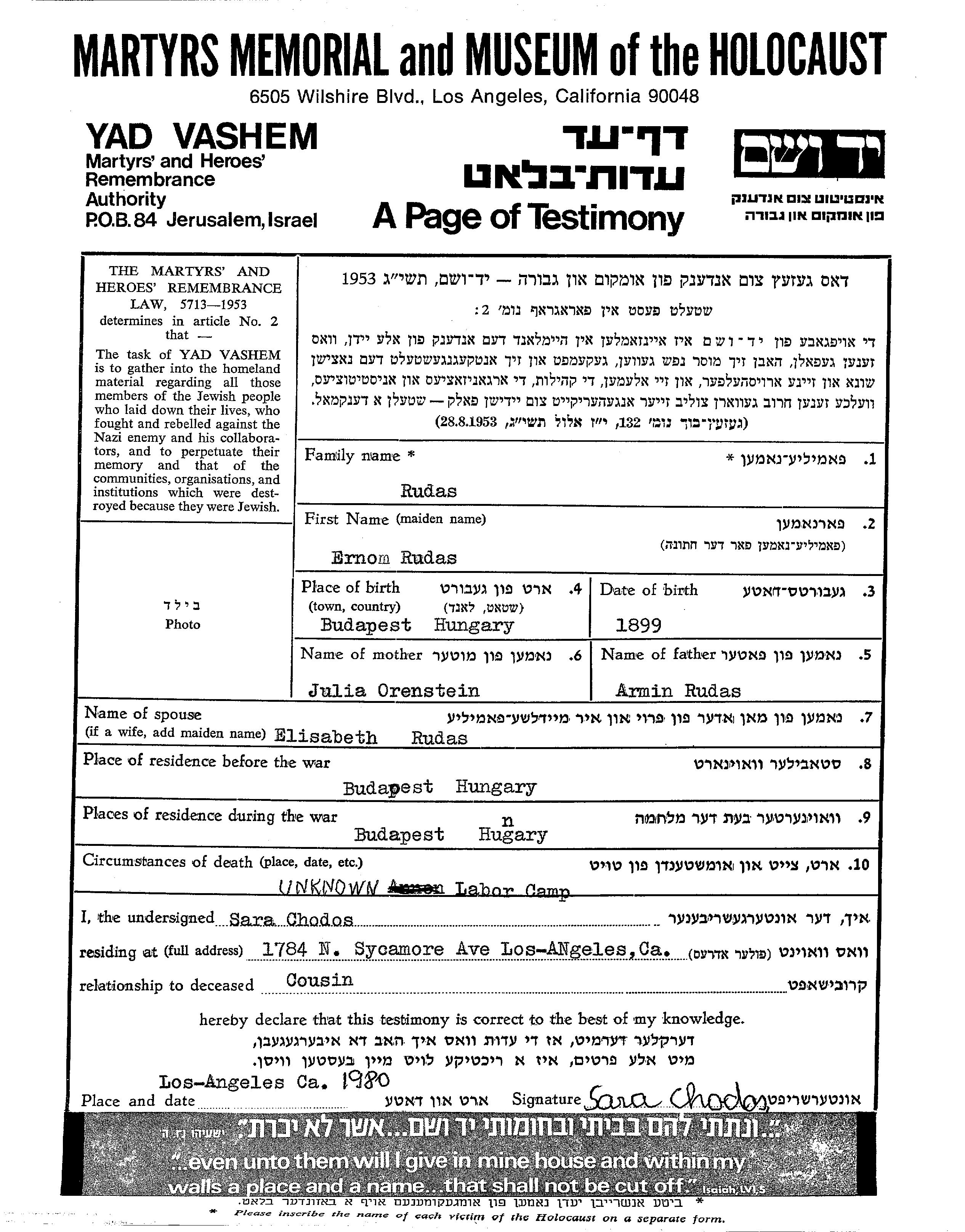 Erno Rudas wurde im Jahr 1899 in Budapest, Ungarn geboren. Er war der Sohn von Armin und Julia. Er war mit Elisabeth Verheiratet. Vor dem Zweiten Weltkrieg lebte er in Budapest, Ungarn. Während des Krieges war er in Budapest, Ungarn.