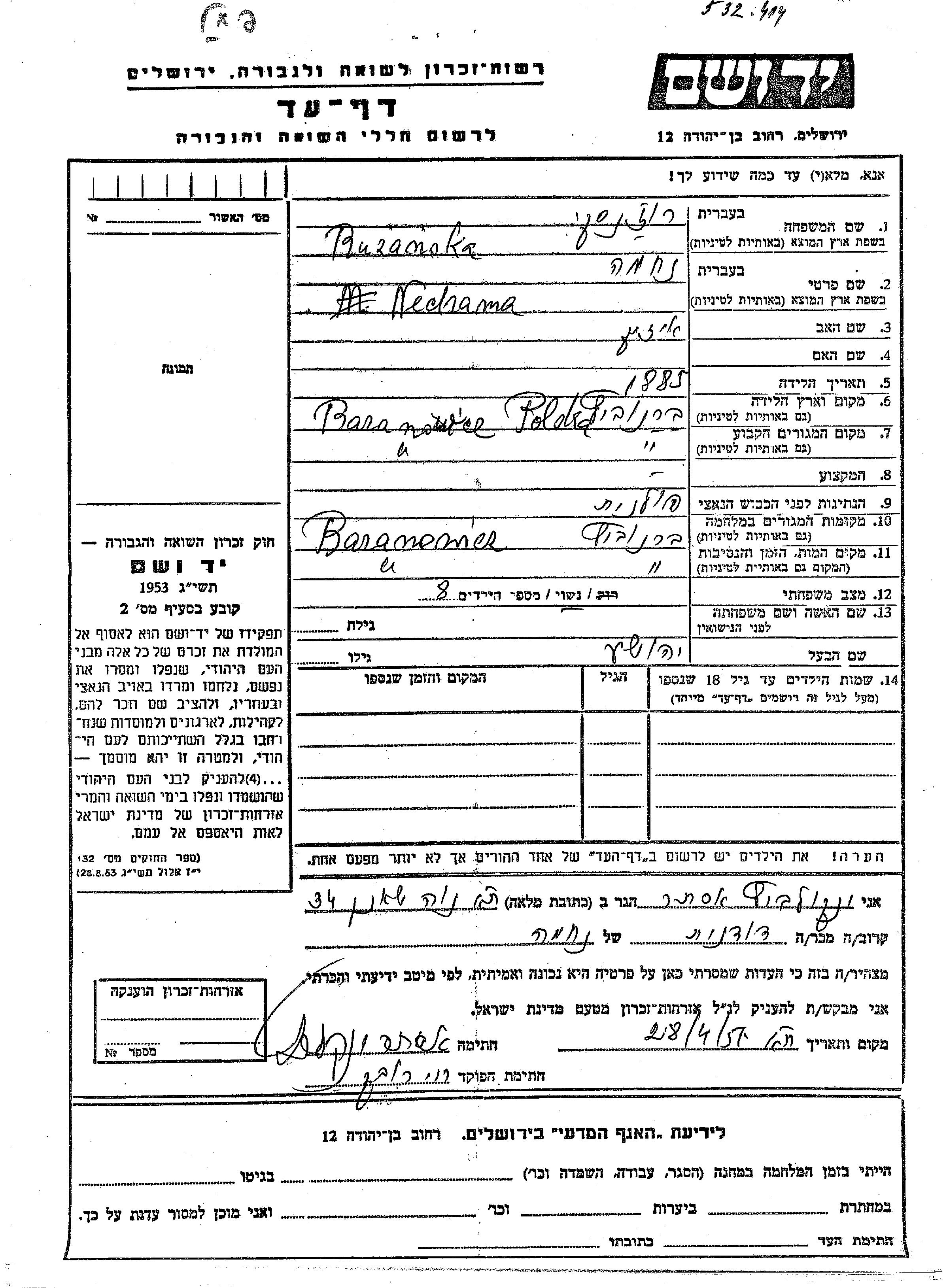 Nechama wurde in der Schoah ermordet. Todesort: Baranowicz, Polen.