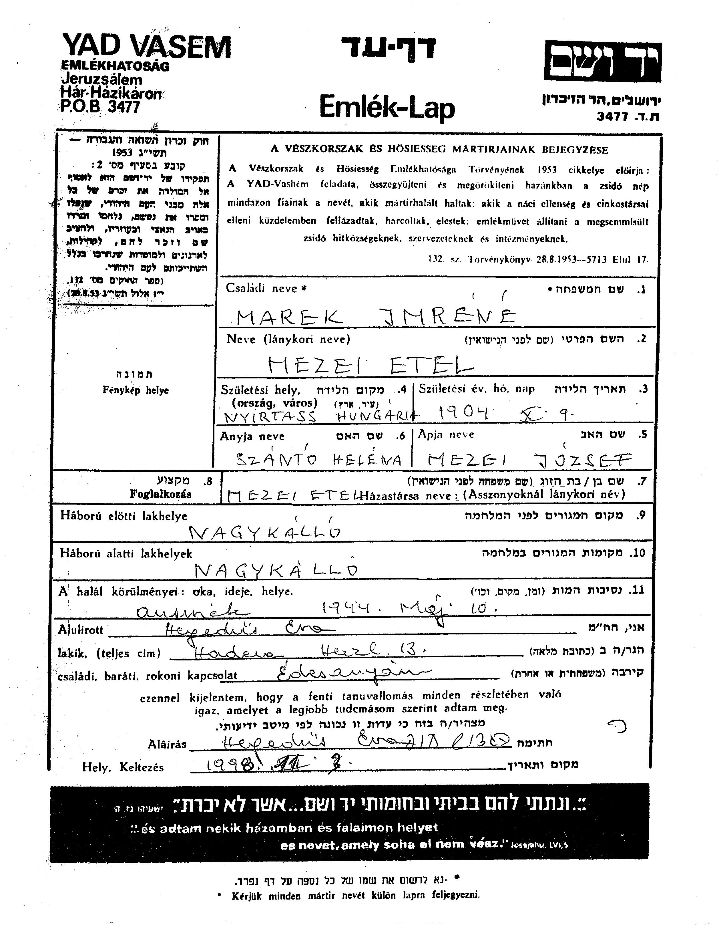 Etel Imrene Marek, geb. Mezei wurde im Jahr 1904 in Nyirtass, Ungarn geboren. Sie war die Tochter von Joszef und Helena. Sie war Verheiratet. Vor dem Zweiten Weltkrieg lebte sie in Nagykallo, Ungarn. Während des Krieges war sie in Nagykallo, Ungarn.