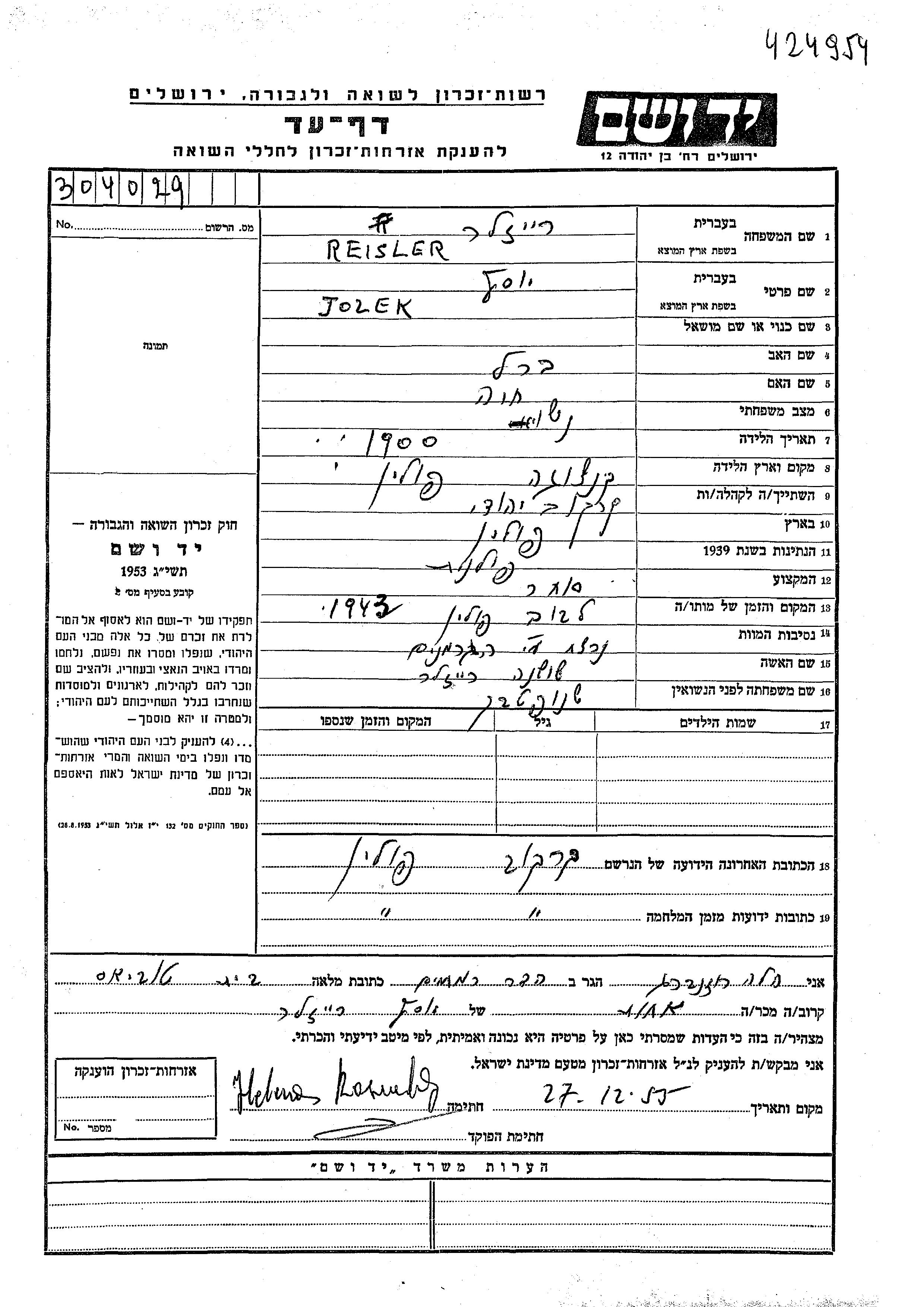 Jolek Yosef Reisler Reizler wurde im Jahr 1900 in Kanczuga, Polen geboren. Er war der Sohn von Berl und Khaia. Er war Kaufmann/-frau. Vor dem Zweiten Weltkrieg lebte er in Krakow, Polen. Während des Krieges war er in Krakow, Polen.