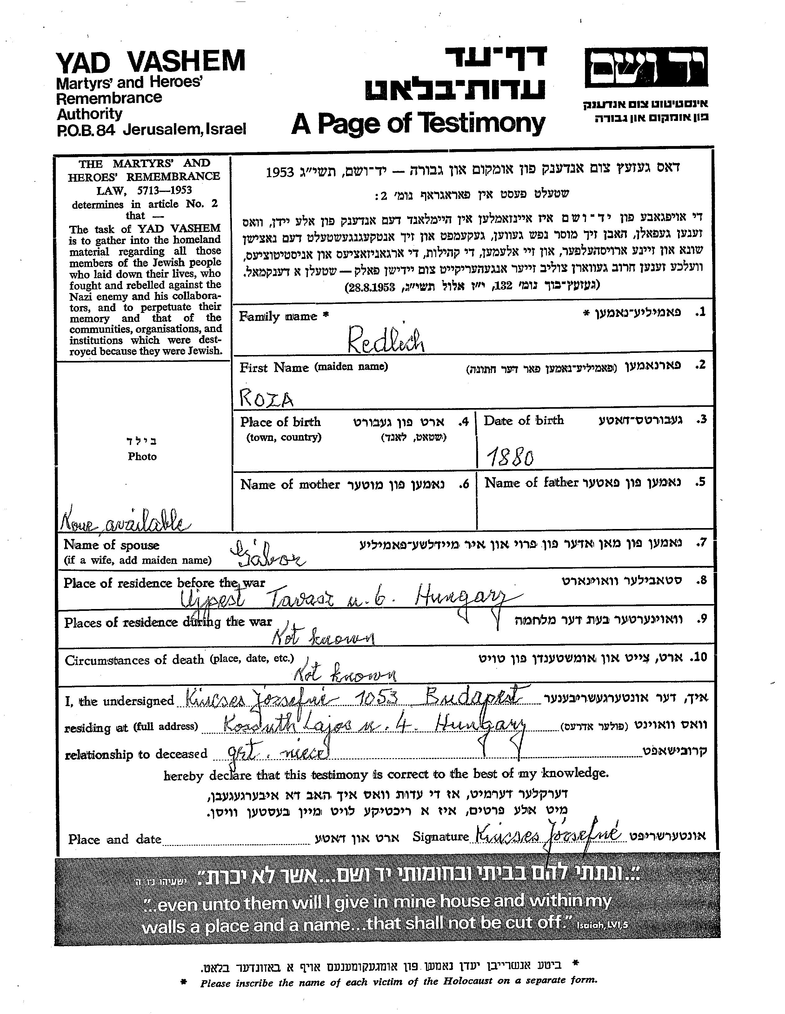 Roza Redlich wurde im Jahr 1880 geboren. Vor dem Zweiten Weltkrieg lebte sie in Ujpest, Ungarn.