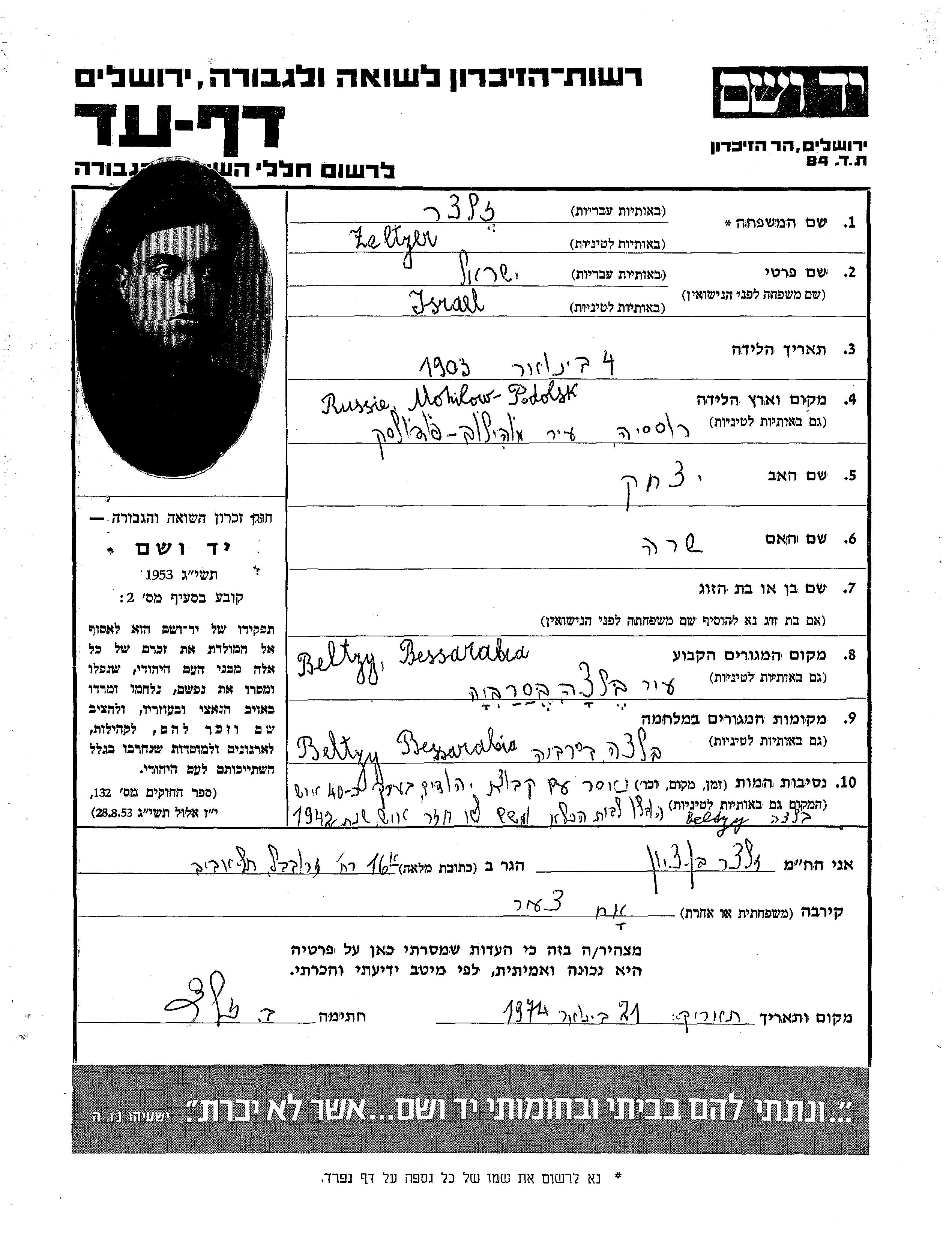 Israel wurde in der Schoah ermordet. Todesort: Beltsy, Rumänien im Jahr 1942.