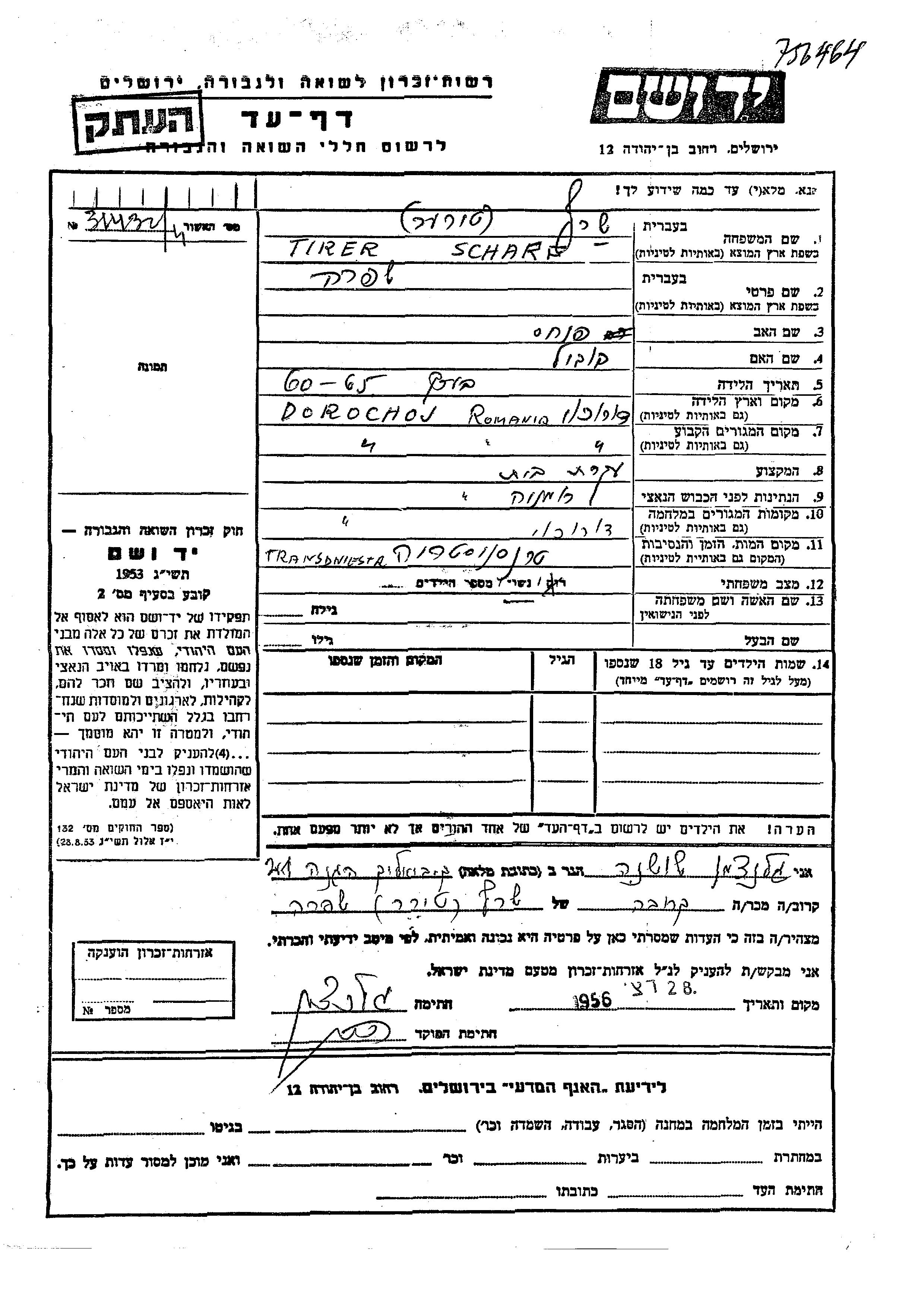 Shifra Scharf, geb. Tirer wurde in Dorochoi, Rumänien geboren. Sie war die Tochter von Pinkhas und Bukil. Sie war Hausfrau und Verheiratet. Vor dem Zweiten Weltkrieg lebte sie in Dorochoi, Rumänien. Während des Krieges war sie in Dorochoi, Rumänien.