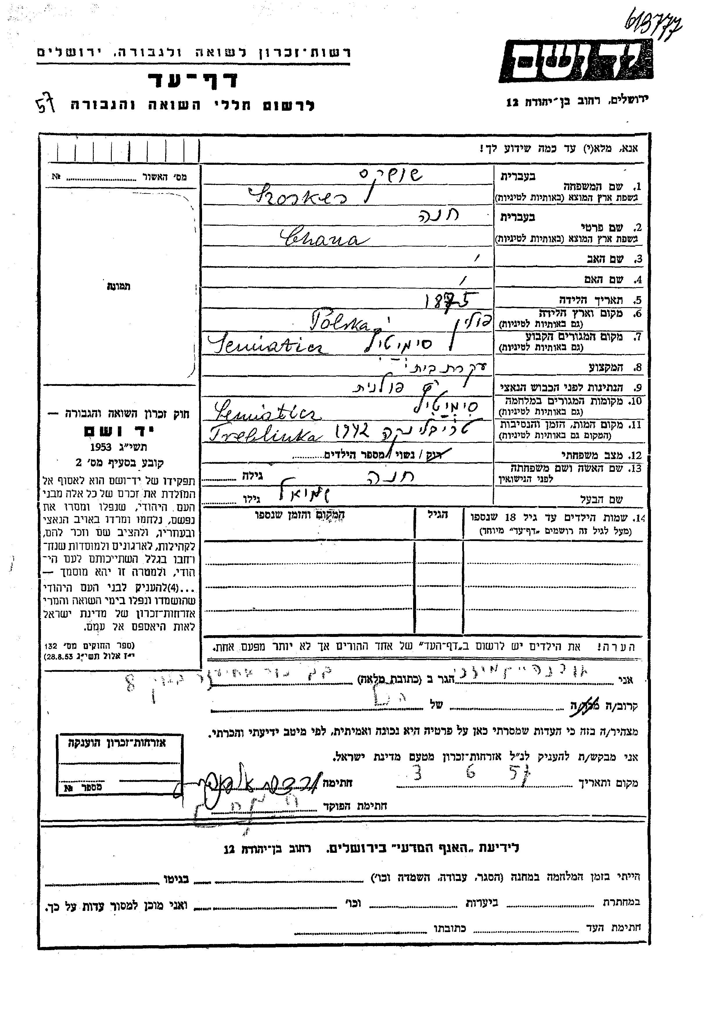 Chana Szoskes wurde im Jahr 1875 in Polen geboren. Sie war Hausfrau und mit Shmuel Verheiratet. Vor dem Zweiten Weltkrieg lebte sie in Simiatice, Polen. Während des Krieges war sie in Simiatice, Polen.