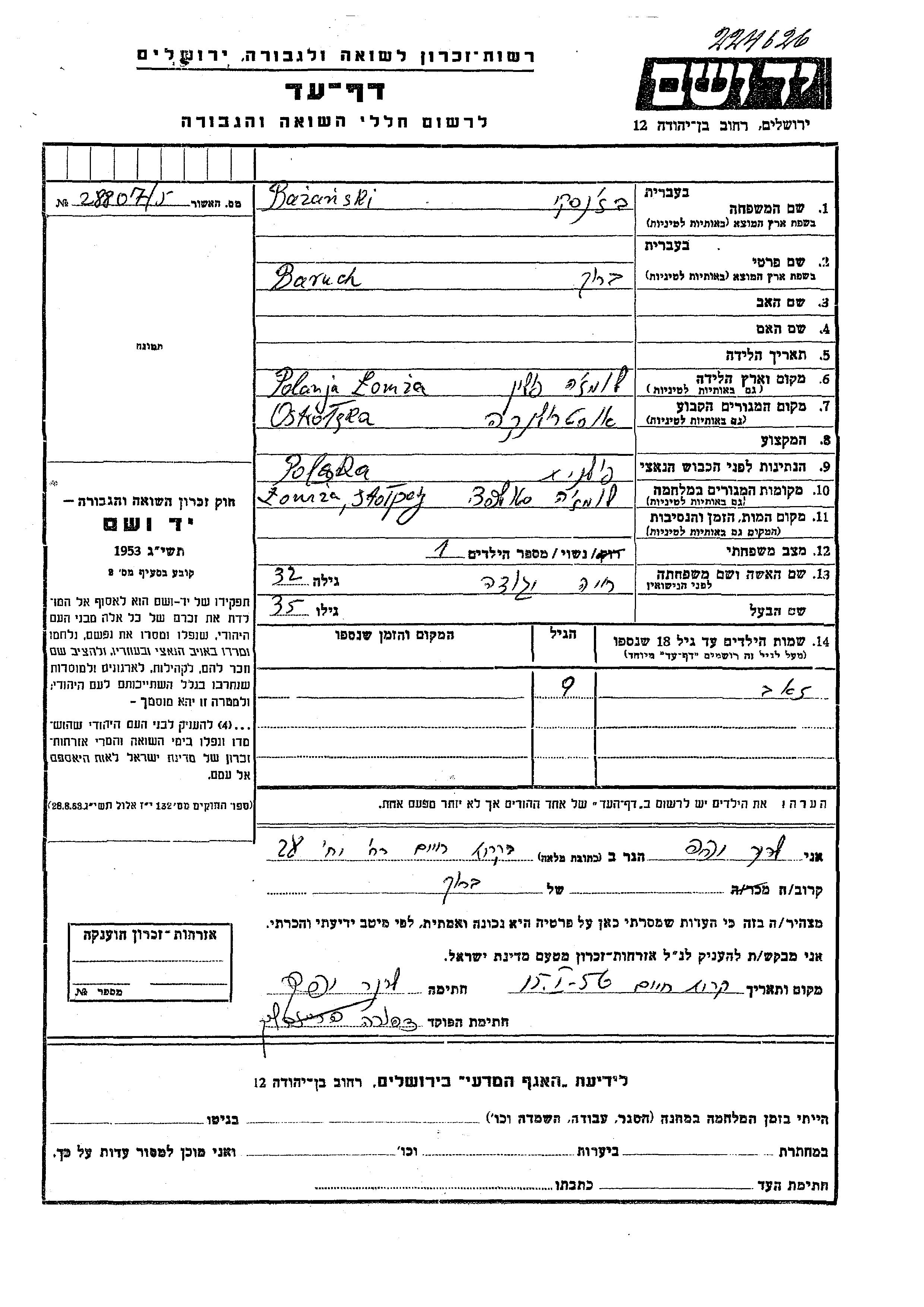 Baruch Baźański wurde in Łomża, Polen geboren. Er war mit Chaia, geb. Iagoda Verheiratet. Vor dem Zweiten Weltkrieg lebte er in Ostrolenka, Polen. Während des Krieges war er in Stolpcy, Polen.