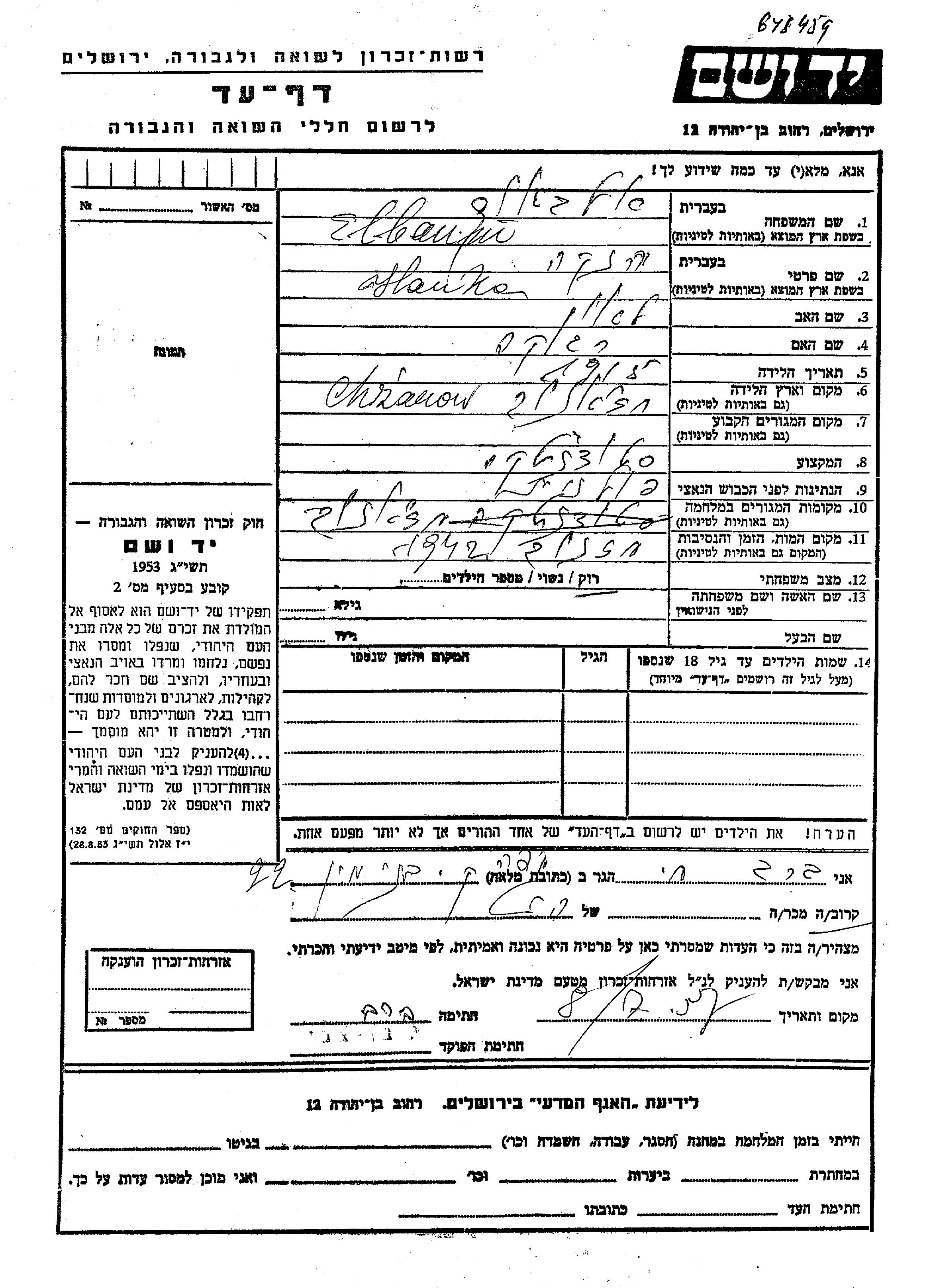 Hanka Elbaum wurde im Jahr 1915 in Chzanow, Polen geboren. Sie war die Tochter von Leon und Rivka. Sie war Student und Ledig. Während des Krieges war sie in Chzanow, Polen.