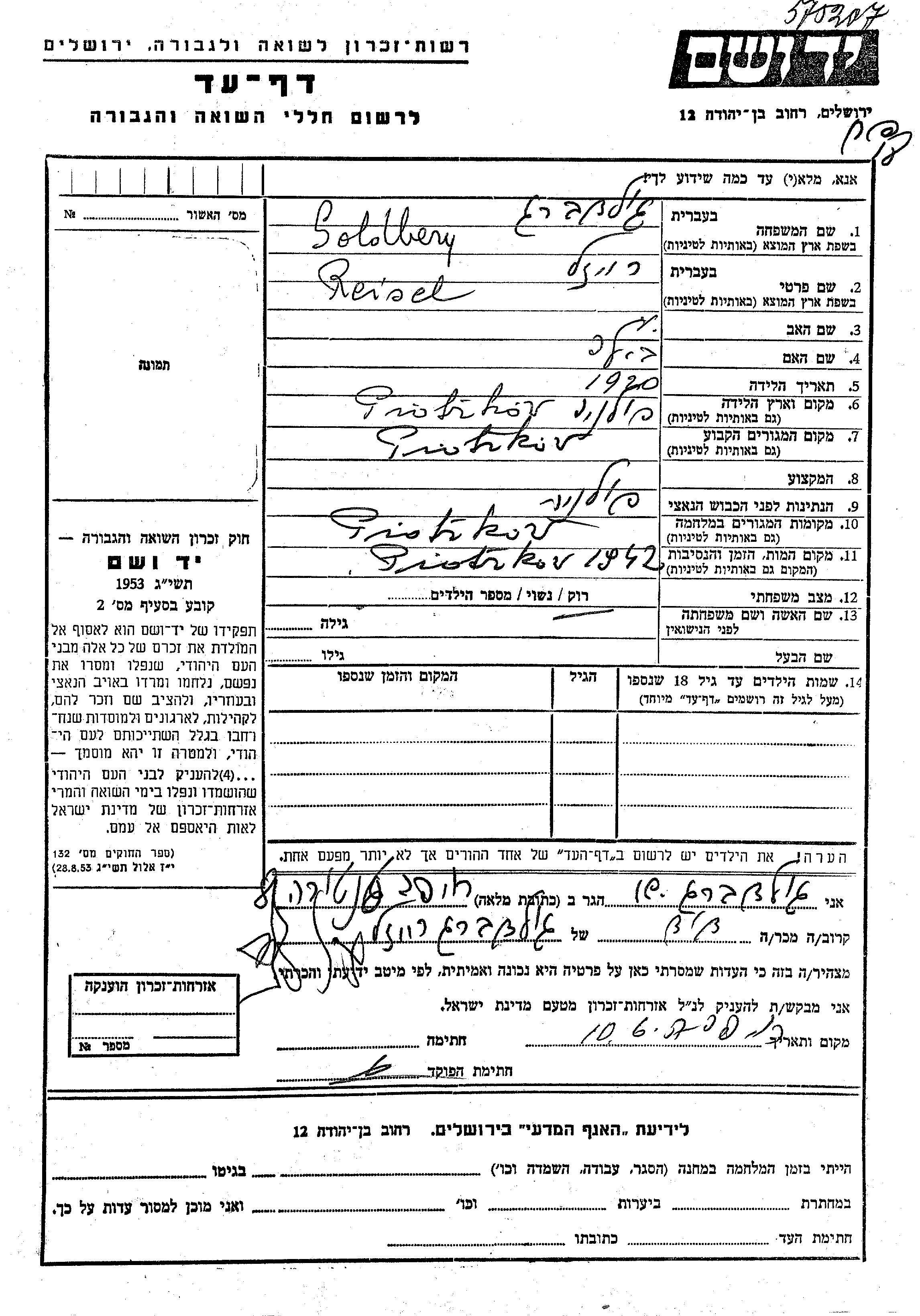 Reisel Goldberg wurde im Jahr 1920 in Piotrkow, Polen geboren. Sie war die Tochter von Bila. Sie war Ledig. Vor dem Zweiten Weltkrieg lebte sie in Piotrkow, Polen. Während des Krieges war sie in Piotrkow, Polen.