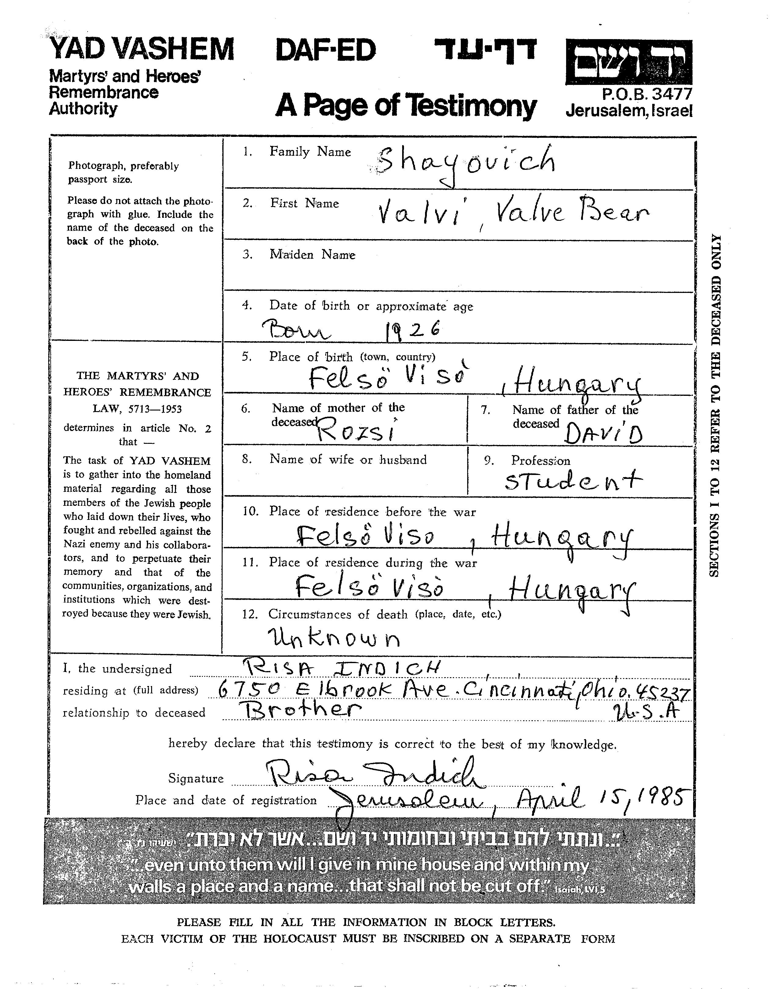 Valvi Bear Shayovich wurde im Jahr 1926 in Felso Viso, Rumänien geboren. Er war der Sohn von David und Rozsi. Er war Student und Ledig. Vor dem Zweiten Weltkrieg lebte er in Felso Viso, Rumänien. Während des Krieges war er in Felso Viso, Rumänien.
