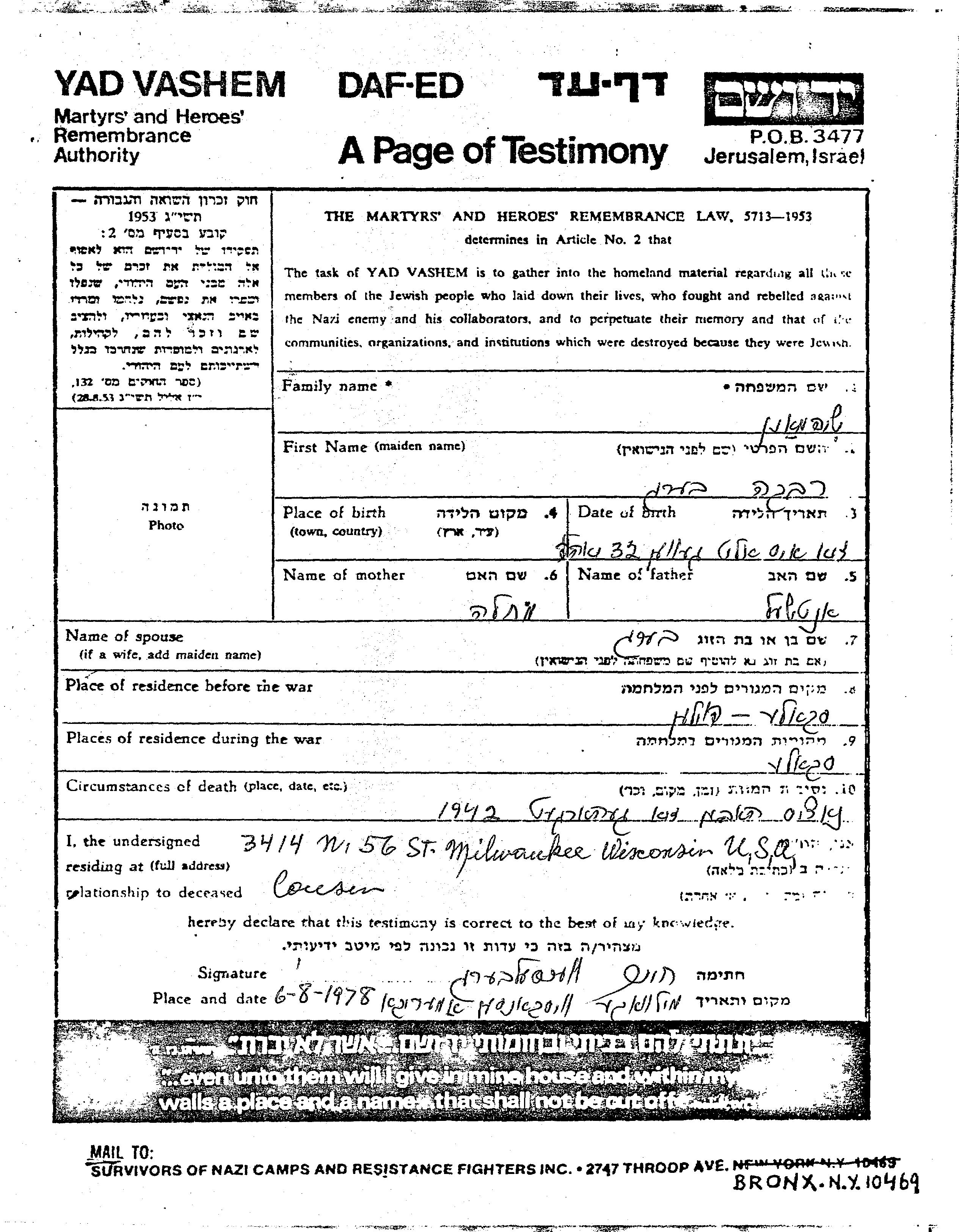 Rivka Shifman, geb. Berg wurde Sie war die Tochter von Anshel und Makhla. Sie war Verheiratet. Vor dem Zweiten Weltkrieg lebte sie in Skola, Polen. Während des Krieges war sie in Skola, Polen.
