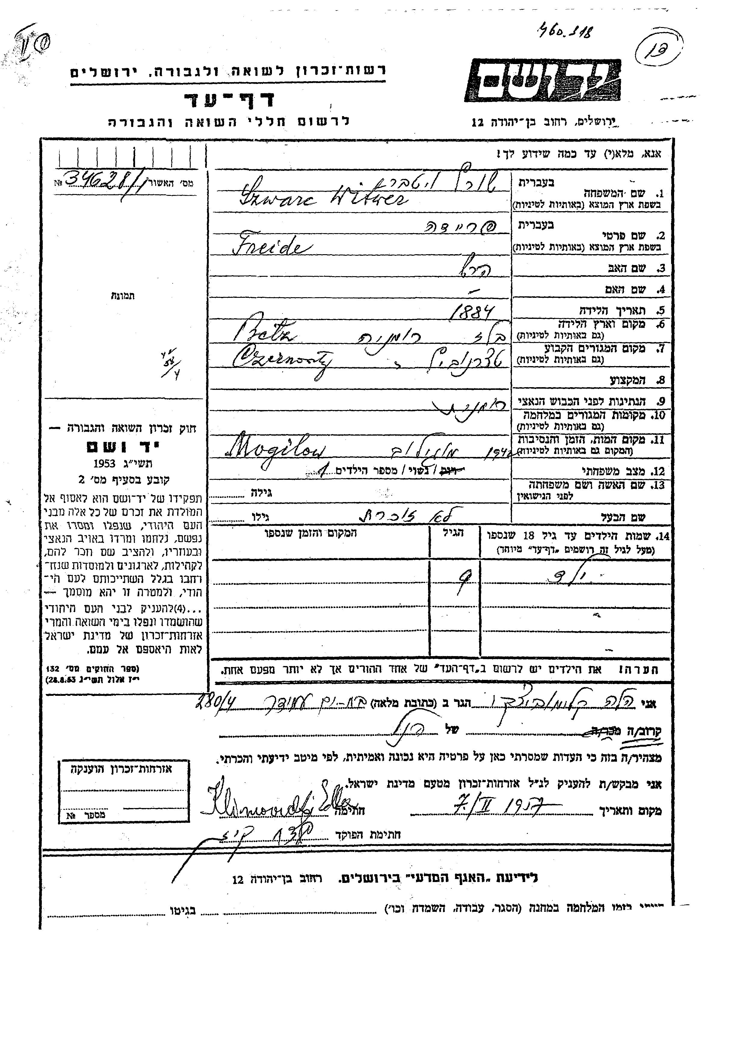 Freida wurde in der Schoah ermordet. Todesort: Mogilov, Ukraine (UdSSR) im Jahr 1942.