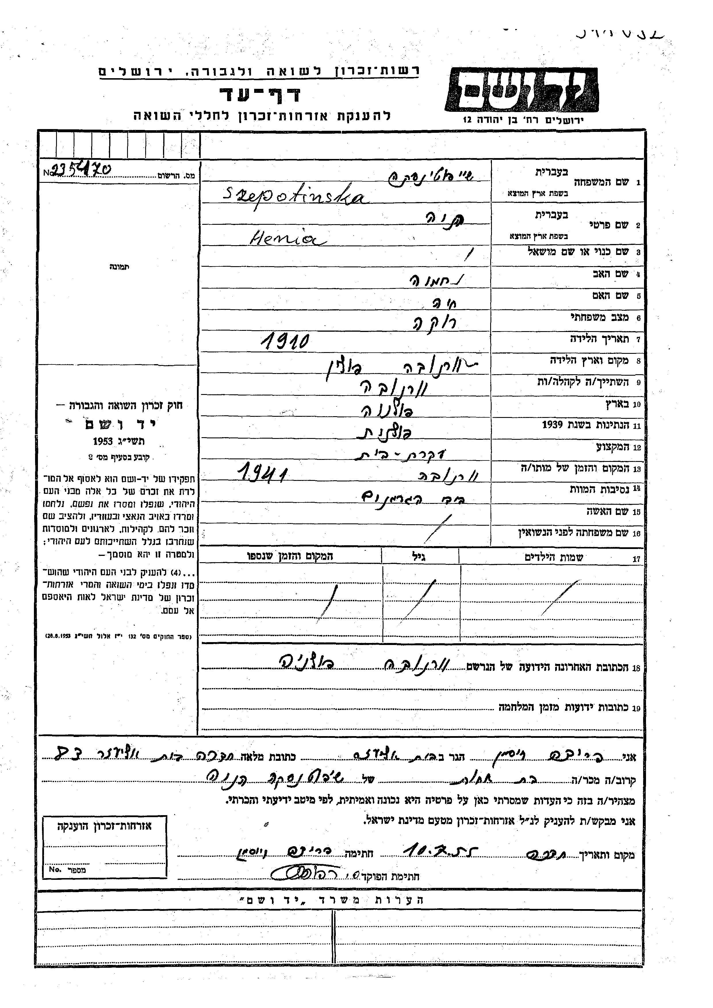 Henia Szepotinska wurde im Jahr 1910 in Weranow, Polen geboren. Sie war die Tochter von Nekhemia und Khaia. Sie war Hausfrau und Ledig. Vor dem Zweiten Weltkrieg lebte sie in Weranow, Polen. Während des Krieges war sie in Weranow, Polen.