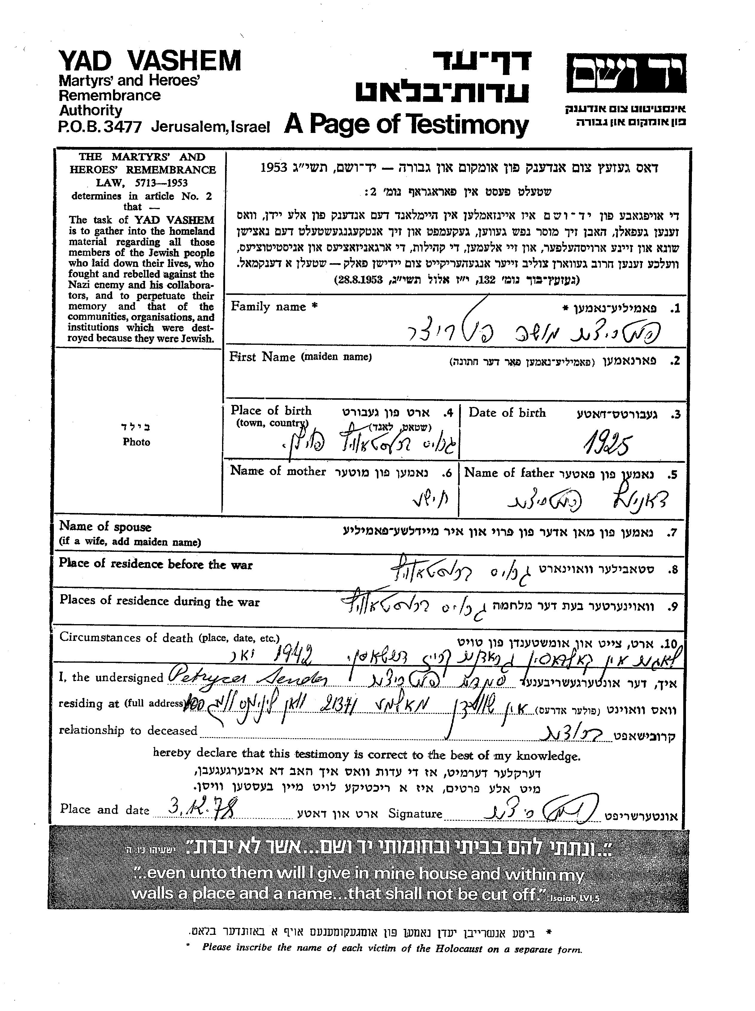 Petricher Moshe 1925 unbekannter Ort, Gedenkblatt
