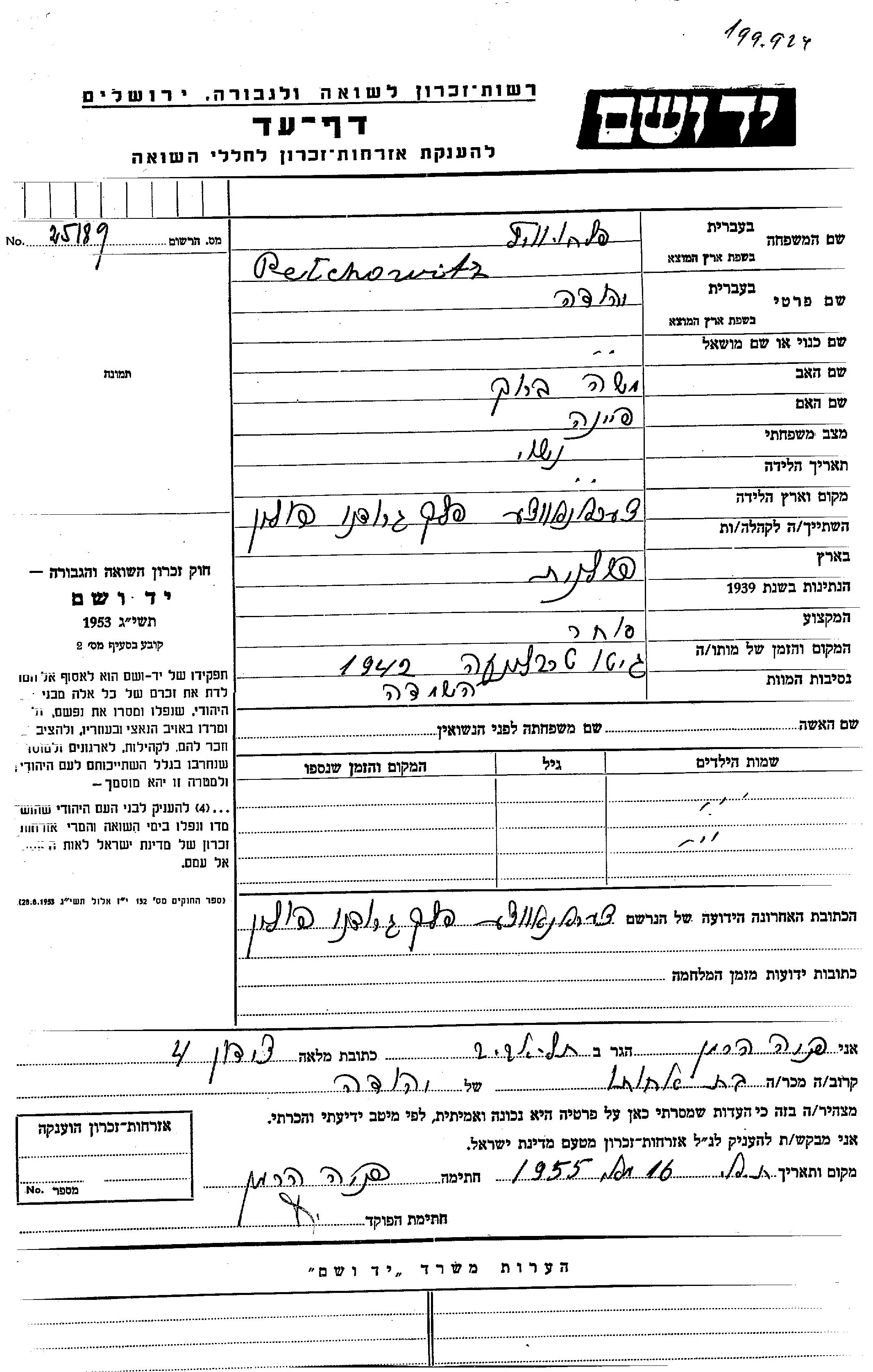 Yehuda Pelchowitz wurde in Grodno, Polen geboren. Er war der Sohn von Moshe Barukh und Faina. Er war Kaufmann/-frau und Verheiratet. Vor dem Zweiten Weltkrieg lebte er in Grodno, Polen.