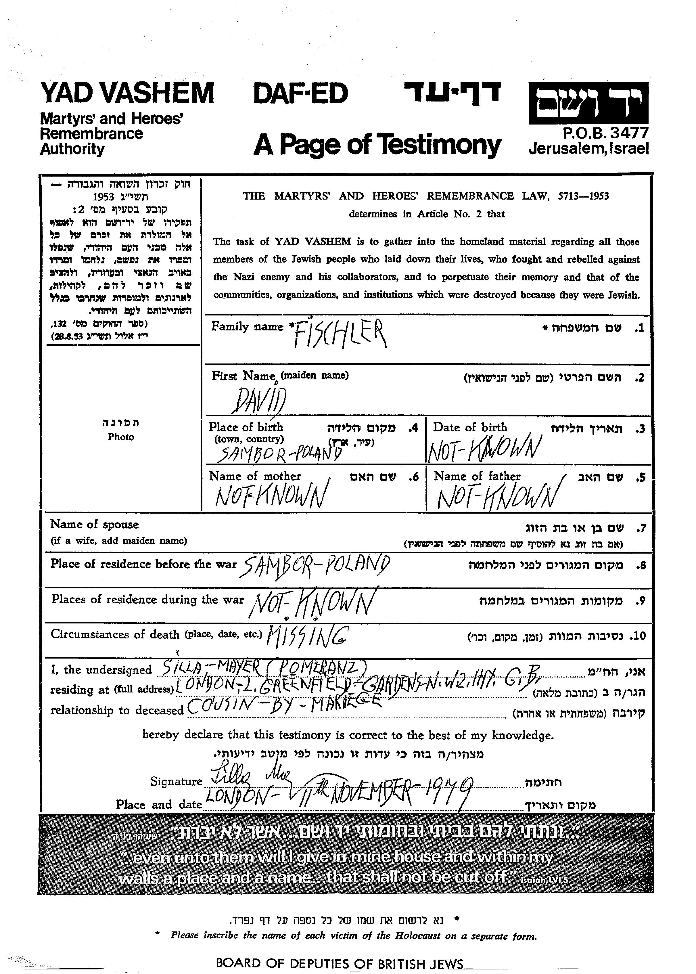 David Fischer wurde in Sambor, Polen geboren. Vor dem Zweiten Weltkrieg lebte er in Sambor, Polen.